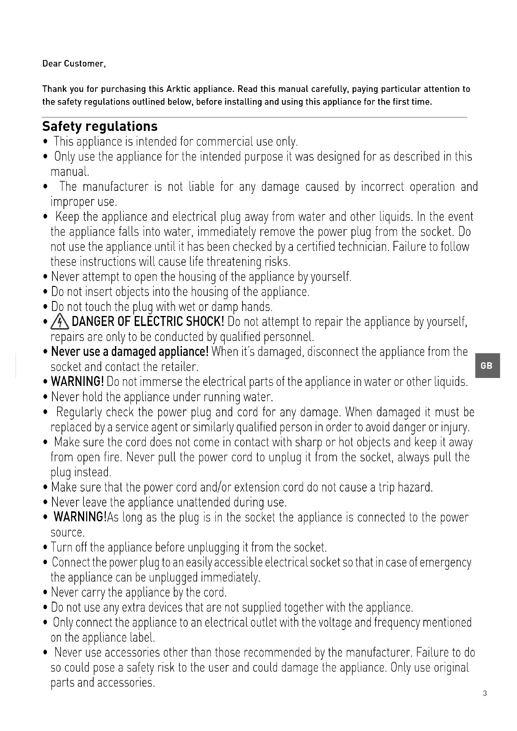 Dear Customer, Thank you for purchasing this Arktic appliance. Read this manual carefully, paying particular attention to the safety regulations outlined below, before installing and using this appliance for the first time. Safety regulations
