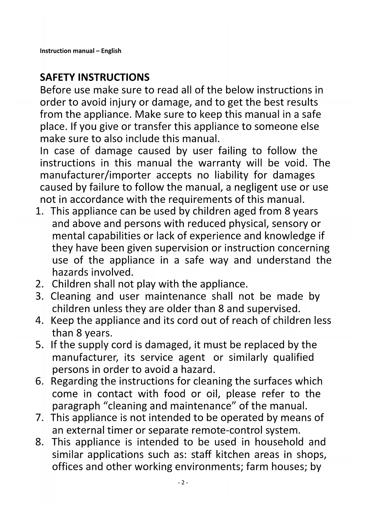 Before delivery our devices are subjected to rigorous quality control. If, despite all care, damage has occurred during production or transportation, please return the device to your dealer. In addition to statutory legal rights, the purchaser has an option to claim under the terms of the following guarantee:- 7 - For the purchased device we provide 2 years guarantee, commencing from the day of sale. If you have a defective product, you can directly go back to the point of purchase. Defects which arise due to improper handling of the device and malfunctions due to interventions and repairs by third parties or the fitting of non-original parts are not covered by this guarantee. Always keep your receipt, without the receipt you can’t claim any form of warranty. Damage caused by not following the instruction manual, will lead to a void of warranty, if this results in consequential damages then we will not be liable. Neither can we hold responsible for material damage or personal injury caused by improper use if the instruction manual is not properly executed. Damage to accessories does not mean free replacement of the whole appliance. In such case please contact our service department. Broken glass or breakage of plastic parts is always subject to a charge. Defects to consumables or parts subjected to wearing, as well as cleaning, maintenance or the replacement of said parts are not covered by the warranty and are to be paid.