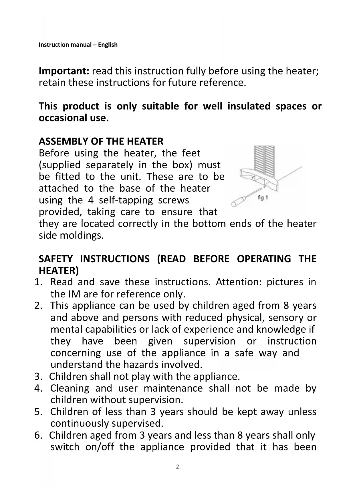 Before using the heater, the feet (supplied separately in the box) must be fitted to the unit. These are to be attached to the base of the heater using the 4 self-tapping screws provided, taking care to ensure that they are located correctly in the bottom ends of the heater side moldings.