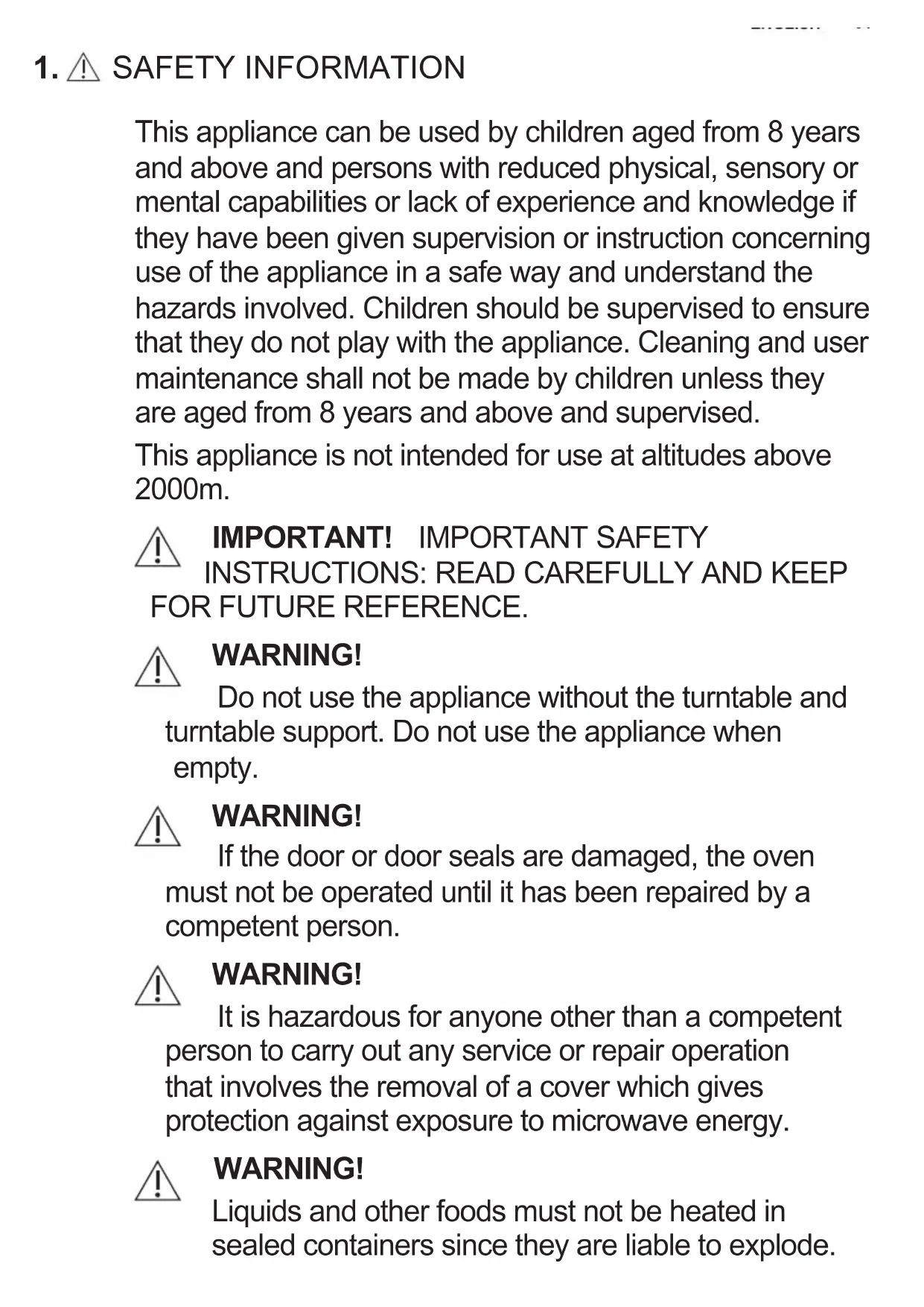 FOR FUTURE REFERENCE. WARNING! Do not use the appliance without the turntable and turntable support. Do not use the appliance when empty. WARNING! If the door or door seals are damaged, the oven must not be operated until it has been repaired by a competent person. WARNING! It is hazardous for anyone other than a competent person to carry out any service or repair operation that involves the removal of a cover which gives protection against exposure to microwave energy. WARNING! Liquids and other foods must not be heated in sealed containers since they are liable to explode.32 www.aeg.com This appliance is intended to be used in household and similar applications such as: sta kitchen areas in shops, oces and other working environments; farm houses; by clients in hotels, motels and other residential environments; bed and breakfast type environments. Only use microwave-safe containers and utensils. Metallic containers for food and beverages are not allowed during microwave cooking. Do not leave the oven unattended when using disposable plastic, paper or other combustible food containers. The microwave oven is intended for heating food and beverages. Drying of food or clothing and heating of warming pads, slippers, sponges, damp cloth and similar may lead to risk of injury, ignition or re. If food being heated begins to smoke, DO NOT OPEN THE DOOR. Turn o and unplug the oven and wait until the food has stopped smoking. Opening the door while food is smoking may cause a re. Microwave heating of beverages can result in delayed eruptive boiling, therefore care has to be taken when handling the container. The contents of feeding bottles and baby food jars shall be stirred or shaken and the temperature checked before consumption, in order to avoid burns. Do not cook eggs in their shells and whole hard boiled eggs should not be heated in microwave ovens since they may explode even after microwave cooking has ended. If the supply cord is damaged it must be replaced by the manufacturer, its service agent or similarly qualied persons in order to avoid a hazard.33 ENGLISH