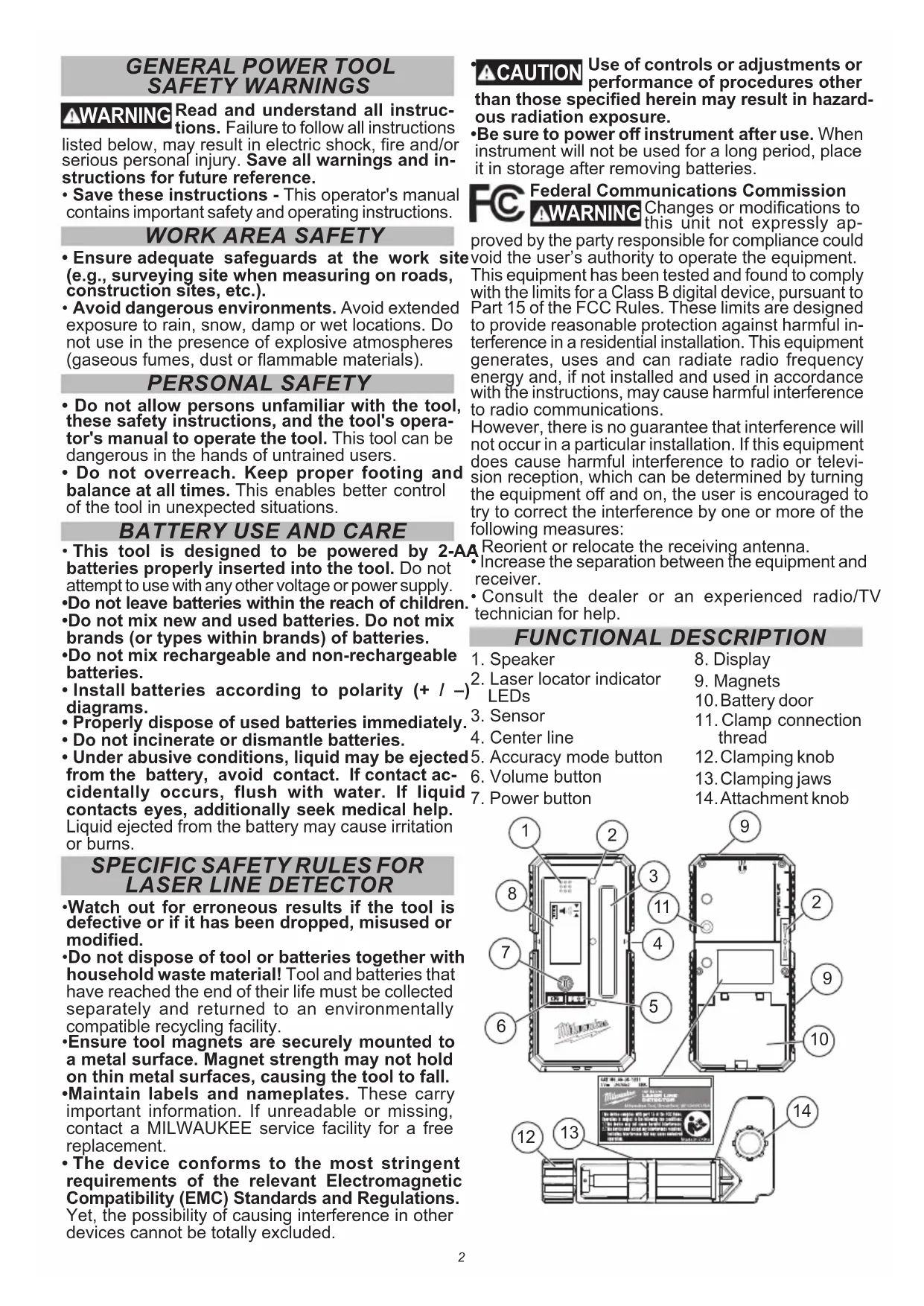service to achieve best performance. This warranty does not cover repair when normal use has exhausted the life of a part including, but not limited to, chucks, brushes, cords, saw shoes, blade clamps, o-rings, seals, bum- pers, driver blades, pistons, strikers, lifters, and bumper cover washers. *This warranty does not cover Air Nailers & Staplers; Airless Paint Sprayer; Cordless Battery Packs; Gasoline Driven Portable Power Generators; Hand Tools; Hoist – Electric, Lever & Hand Chain; M12™ Heated Gear; Reconditioned Product; and Test & Measurement Products. There are separate and distinct warranties available for these products. **The warranty period for Job Site Radios, M12™ Power Port, M18™ Power Source, Jobsite Fan and Trade Titan™ Industrial Work Carts is one (1) year from the date of purchase. The warranty period for the M18 FUEL™ 1" D-Handle High Torque Impact Wrenches, Drain Cleaning Cables, AIRSNAKE™ Drain Cleaning Air Gun Accessories, and REDLITHIUM™ USB Laser Levels is two (2) years from the date of purchase. The warranty period for the M18™ Compact Heat Gun, 8 Gallon Dust Extractor, M18™ Framing Nailers, M18 FUEL™ 1/2" Ext. Anvil Controlled Torque Impact Wrench w/ ONE-KEY™, M18 FUEL™ 1" High Torque Impact Wrench w/ ONE-KEY™, M18 FUEL™ 2 Gal. Compact Quiet Compressor, M12™ Laser Levels, 165' Laser Detector, and M12™ 23GA Pin Nailer is three (3) years from the date of purchase. The warranty period for the LED in the LED Work Light and the LED Upgrade Bulb for the Work Light is the lifetime of the product subject to the limitations above. If during normal use the LED or LED Bulb fails, the part will be replaced free of charge. Warranty Registration is not necessary to obtain the applicable warranty on a MILWAUKEE power tool product. The manufacturing date of the product will be used to determine the warranty period if no proof of pur- chase is provided at the time warranty service is requested. ACCEPTANCE OF THE EXCLUSIVE REPAIR AND REPLACEMENT REMEDIES DESCRIBED HEREIN IS A CONDITION OF THE CON- TRACT FOR THE PURCHASE OF EVERY MILWAUKEE PRODUCT. IF YOU DO NOT AGREE TO THIS CONDITION, YOU SHOULD NOT PURCHASE THE PRODUCT. IN NO EVENT SHALL MILWAUKEE BE LIABLE FOR ANY INCIDENTAL, SPECIAL, CONSEQUENTIAL OR PUNITIVE DAMAGES, OR FOR ANY COSTS, ATTORNEY FEES, EXPENSES, LOSSES OR DELAYS ALLEGED TO BE AS A CONSE- QUENCE OF ANY DAMAGE TO, FAILURE OF, OR DEFECT IN ANY PRODUCT INCLUDING, BUT NOT LIMITED TO, ANY CLAIMS FOR LOSS OF PROFITS. SOME STATES DO NOT ALLOW THE EXCLUSION OR LIMITATION OF INCIDENTAL OR CONSEQUENTIAL DAMAGES, SO THE ABOVE LIMITATION OR EXCLUSION MAY NOT APPLY TO YOU. THIS WARRANTY IS EXCLUSIVE AND IN LIEU OF ALL OTHER EXPRESS WARRANTIES, WRITTEN OR ORAL. TO THE EXTENT PERMITTED BY LAW, MILWAUKEE DISCLAIMS ANY IMPLIED WAR- RANTIES, INCLUDING WITHOUT LIMITATION ANY IMPLIED WAR- RANTY OF MERCHANTABILITY OR FITNESS FOR A PARTICULAR USE OR PURPOSE; TO THE EXTENT SUCH DISCLAIMER IS NOT PERMITTED BY LAW, SUCH IMPLIED WARRANTIES ARE LIMITED TO THE DURATION OF THE APPLICABLE EXPRESS WARRANTY AS DESCRIBED ABOVE. SOME STATES DO NOT ALLOW LIMITATIONS ON HOW LONG AN IMPLIED WARRANTY LASTS, SO THE ABOVE LIMITATION MAY NOT APPLY TO YOU, THIS WARRANTY GIVES YOU SPECIFIC LEGAL RIGHTS, AND YOU MAY ALSO HAVE OTHER RIGHTS WHICH VARY FROM STATE TO STATE. This warranty applies to product sold in the U.S.A. and Canada only. Please consult the ‘Service Center Search’ in the Parts & Service sec- tion of MILWAUKEE’s website www.milwaukeetool.com or call 1.800. SAWDUST (1.800.729.3878) to locate your nearest service facility for warranty and non-warranty service on a Milwaukee electric power tool. RÈGLES DE SÉCURITÉ GÉNÉRALES