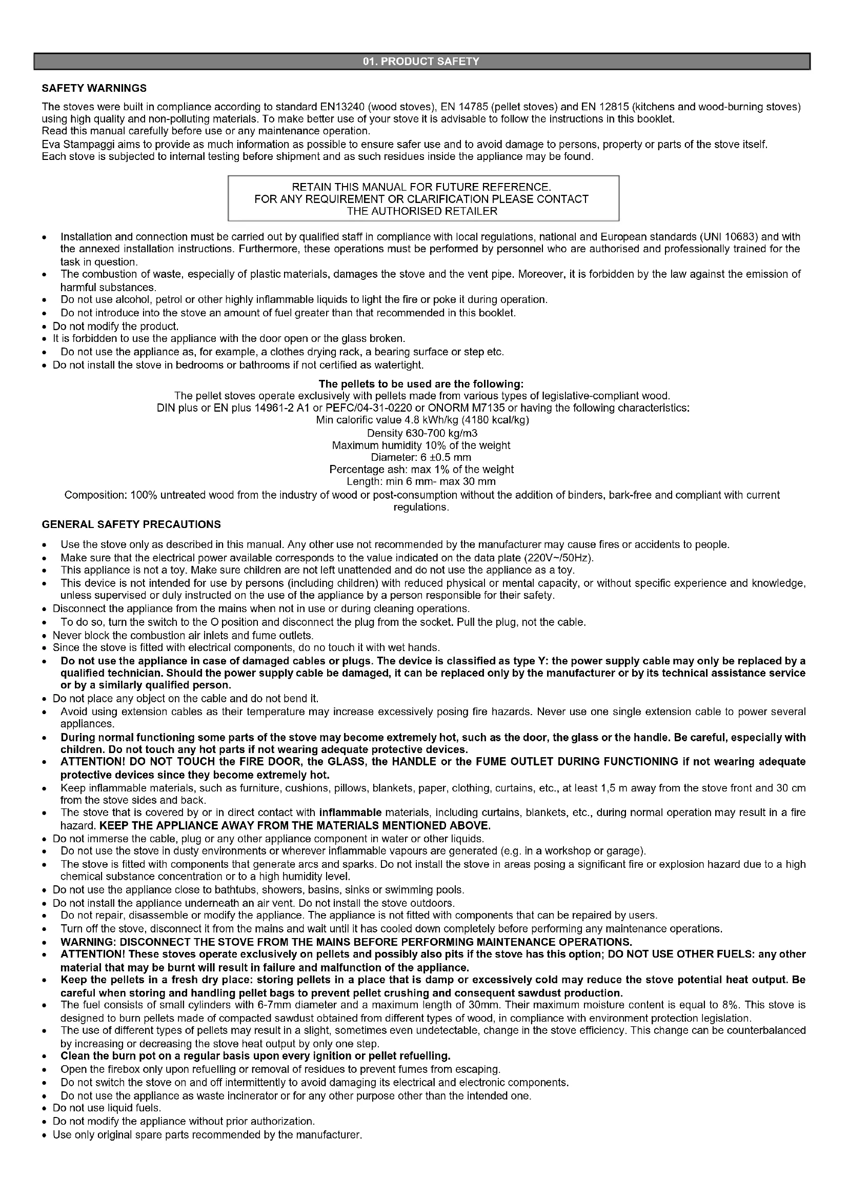 SAFETY WARNINGS The stoves were built in compliance according to standard EN13240 (wood stoves), EN 14785 (pellet stoves) and EN 12815 (kitchens and wood-burning stoves) using high quality and non-polluting materials. To make better use of your stove it is advisable to follow the instructions in this booklet. Read this manual carefully before use or any maintenance operation. Eva Stampaggi aims to provide as much information as possible to ensure safer use and to avoid damage to persons, property or parts of the stove itself. Each stove is subjected to internal testing before shipment and as such residues inside the appliance may be found.