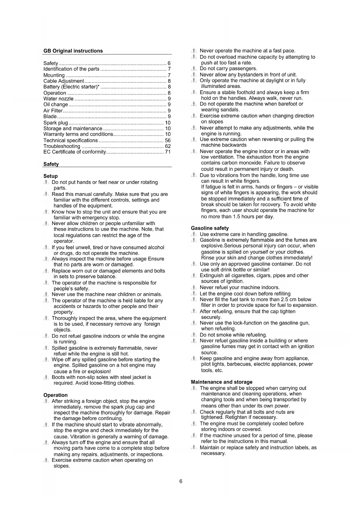 - EC Certificate of conformity Safety Setup Do not put hands or feet near or under rotating parts. Read this manual carefully. Make sure that you are familiar with the different controls, settings and handles of the equipment. Know how to stop the unit and ensure that you are familiar with emergency stop. Never allow children or people unfamiliar with these instructions to use the machine. Note, that local regulations can restrict the age of the operator. If you feel unwell, tired or have consumed alcohol or drugs, do not operate the machine. Always inspect the machine before usage Ensure that no parts are worn or damaged. Replace worn out or damaged elements and bolts in sets to preserve balance. The operator of the machine is responsible for people’s safety. Never use the machine near children or animals. The operator of the machine is held liable for any accidents or hazards to other people and their property. Thoroughly inspect the area, where the equipment is to be used, if necessary remove any foreign objects. Do not refuel gasoline indoors or while the engine is running. Spilled gasoline is extremely flammable, never refuel while the engine is still hot. Wipe off any spilled gasoline before starting the engine. Spilled gasoline on a hot engine may cause a fire or explosion! Boots with non-slip soles with steel jacket is required. Avoid loose-fitting clothes. Operation After striking a foreign object, stop the engine immediately, remove the spark plug cap and inspect the machine thoroughly for damage. Repair the damage before continuing. If the machine should start to vibrate abnormally, stop the engine and check immediately for the cause. Vibration is generally a warning of damage. Always turn off the engine and ensure that all moving parts have come to a complete stop before making any repairs, adjustments, or inspections. Exercise extreme caution when operating on slopes. Never operate the machine at a fast pace. Do not overload machine capacity by attempting to push at too fast a rate. Do not carry passengers. Never allow any bystanders in front of unit. Only operate the machine at daylight or in fully illuminated areas. Ensure a stable foothold and always keep a firm hold on the handles. Always walk, never run. Do not operate the machine when barefoot or wearing sandals. Exercise extreme caution when changing direction on slopes Never attempt to make any adjustments, while the engine is running. Use extreme caution when reversing or pulling the machine backwards Never operate the engine indoor or in areas with low ventilation. The exhaustion from the engine contains carbon monoxide. Failure to observe could result in permanent injury or death. Due to vibrations from the handle, long time use can result in white fingers. If fatigue is felt in arms, hands or fingers – or visible signs of white fingers is appearing, the work should be stopped immediately and a sufficient time of break should be taken for recovery. To avoid white fingers, each user should operate the machine for no more than 1.5 hours per day. Gasoline safety Use extreme care in handling gasoline. Gasoline is extremely flammable and the fumes are explosive.Serious personal injury can occur, when gasoline is spilled on yourself or your clothes. Rinse your skin and change clothes immediately! Use only an approved gasoline container. Do not use soft drink bottle or similar! Extinguish all cigarettes, cigars, pipes and other sources of ignition. Never refuel your machine indoors. Let the engine cool down before refilling Never fill the fuel tank to more than 2.5 cm below filler in order to provide space for fuel to expansion. After refueling, ensure that the cap tighten securely. Never use the lock-function on the gasoline gun, when refueling. Do not smoke while refueling. Never refuel gasoline inside a building or where gasoline fumes may get in contact with an ignition source. Keep gasoline and engine away from appliance, pilot lights, barbecues, electric appliances, power tools, etc. Maintenance and storage The engine shall be stopped when carrying out maintenance and cleaning operations, when changing tools and when being transported by means other than under its own power. Check regularly that all bolts and nuts are tightened. Retighten if necessary. The engine must be completely cooled before storing indoors or covered. If the machine unused for a period of time, please refer to the instructions in this manual. Maintain or replace safety and instruction labels, as necessary.7 Only use orginal spare parts or accessories. If not orginal parts or accessories is used, the liablility is no longer applied. Miscellaneous The motor is not pre-filled with oil. Always before start check the engine oil level. Factory-fitted control devices, such as the handle- mounted clutch cable, must not be removed or exposed. Only drain the fuel tank outdoors. Gasoline is extremely flammable and the fumes are explosive. Ensure that the machine is properly secured when transported on a flatbed etc. p. 71