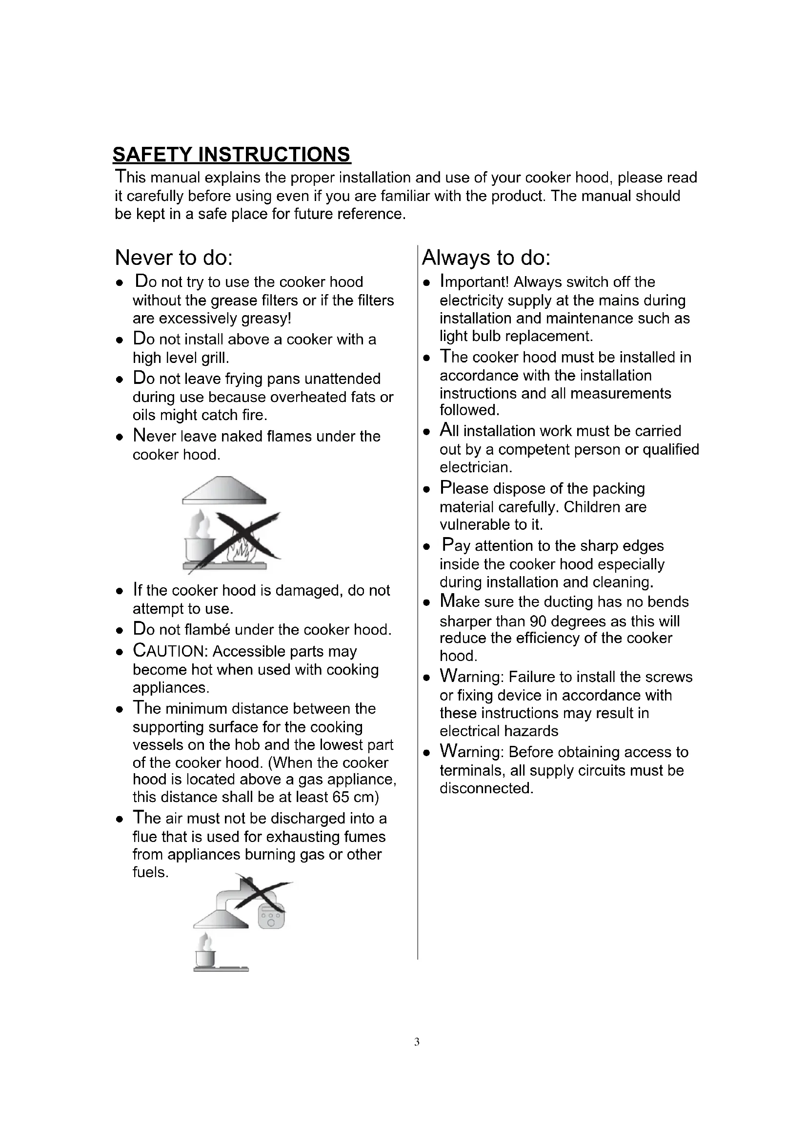 SAFETY INSTRUCTIONS This manual explains the proper installation and use of your cooker hood, please read it carefully before using even if you are familiar with the product. The manual should be kept in a safe place for future reference. Never to do: ● Do not try to use the cooker hood without the grease filters or if the filters are excessively greasy! ● Do not install above a cooker with a high level grill. ● Do not leave frying pans unattended during use because overheated fats or oils might catch fire. ● Never leave naked flames under the cooker hood. ● If the cooker hood is damaged, do not attempt to use. ● Do not flambé under the cooker hood. ● CAUTION: Accessible parts may become hot when used with cooking appliances. ● The minimum distance between the supporting surface for the cooking vessels on the hob and the lowest part of the cooker hood. (When the cooker hood is located above a gas appliance, this distance shall be at least 65 cm) ● The air must not be discharged into a flue that is used for exhausting fumes from appliances burning gas or other fuels.