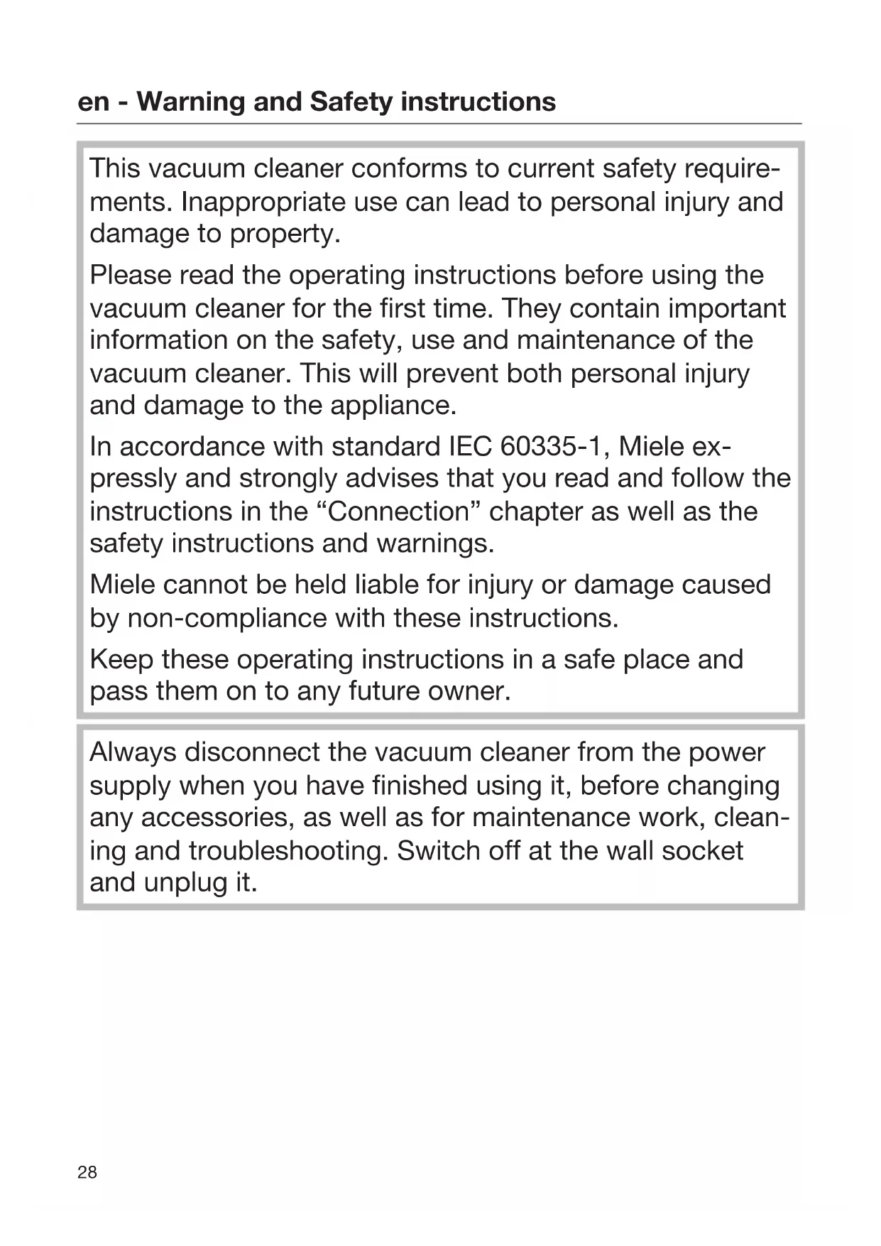 This vacuum cleaner conforms to current safety require- ments. Inappropriate use can lead to personal injury and damage to property. Please read the operating instructions before using the vacuum cleaner for the first time. They contain important information on the safety, use and maintenance of the vacuum cleaner. This will prevent both personal injury and damage to the appliance. In accordance with standard IEC60335-1, Miele ex- pressly and strongly advises that you read and follow the instructions in the “Connection” chapter as well as the safety instructions and warnings. Miele cannot be held liable for injury or damage caused by non-compliance with these instructions. Keep these operating instructions in a safe place and pass them on to any future owner. Always disconnect the vacuum cleaner from the power supply when you have finished using it, before changing any accessories, as well as for maintenance work, clean- ing and troubleshooting. Switch off at the wall socket and unplug it.en - Warning and Safety instructions