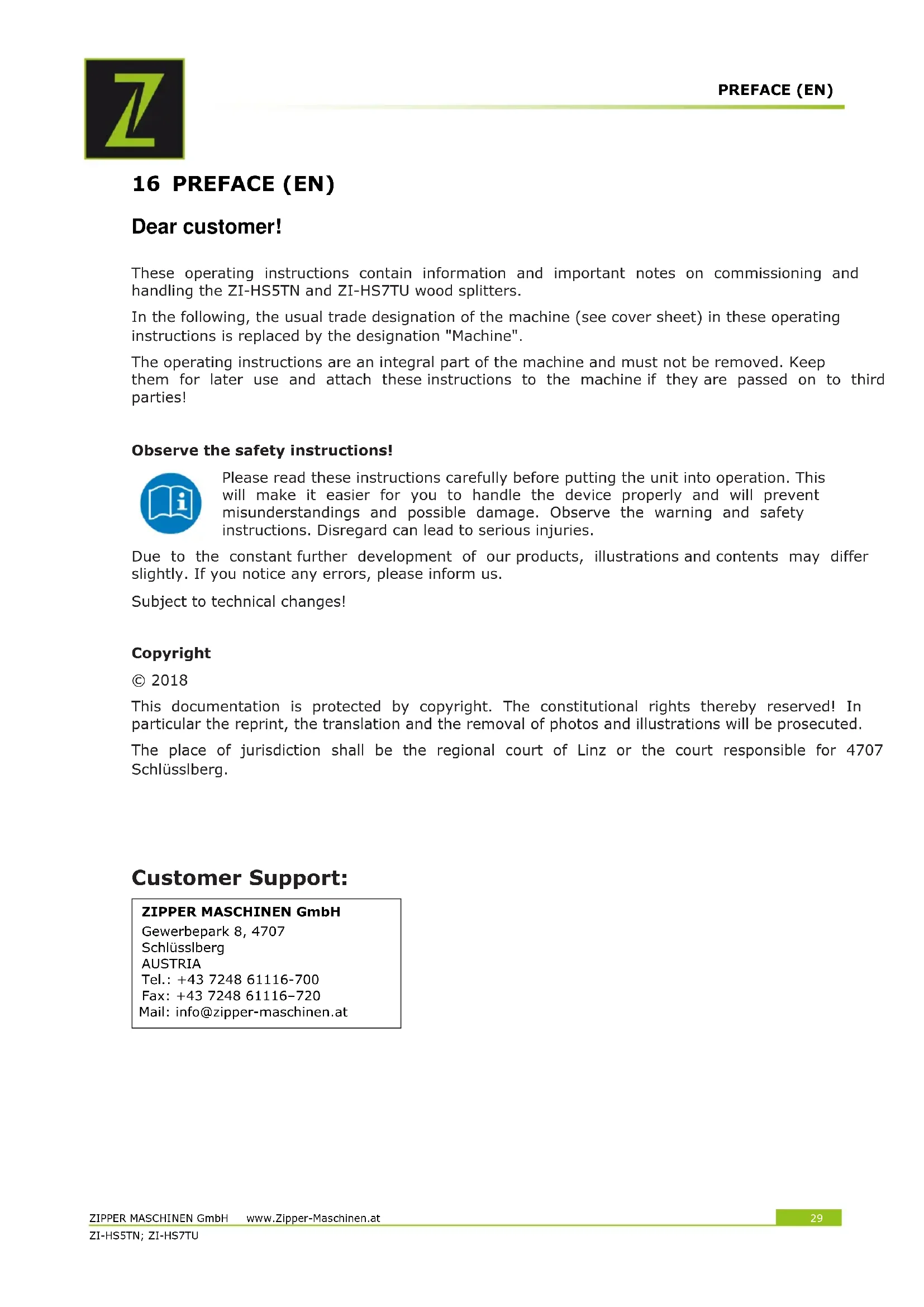 Customer Support: ZIPPER MASCHINEN GmbH Gewerbepark 8, 4707 Schlüsslberg AUSTRIA Tel.: +43 7248 61116-700 Fax: +43 7248 61116–720 Mail: info@zipper-maschinen.atSAFETY ZIPPER MASCHINEN GmbH www.Zipper-Maschinen.at 30 ZI-HS5TN; ZI-HS7TU 17 SAFETY Only use the machine in a technically perfect condition and in accordance with its intended use, safety-conscious and aware of the dangers! Have faults which could impair safety rectified immediately!! The machinery is intended exclusively for the following activities: For splitting wood in grain direction, with dimensions within the limits specified in the "Technical data" section. The splitting process of the machine is intended for operation by only one person. ZIPPER-MASCHINEN accepts no responsibility or warranty for any other use or use beyond this and for any resulting damage to property or injury. Operating conditions: The machine is intended for use under the following conditions: Rel. humidity: max. 50 % Temperature (Operation) +5° C bis +40° C Temperature (storage, transport) -25° C bis +55° C