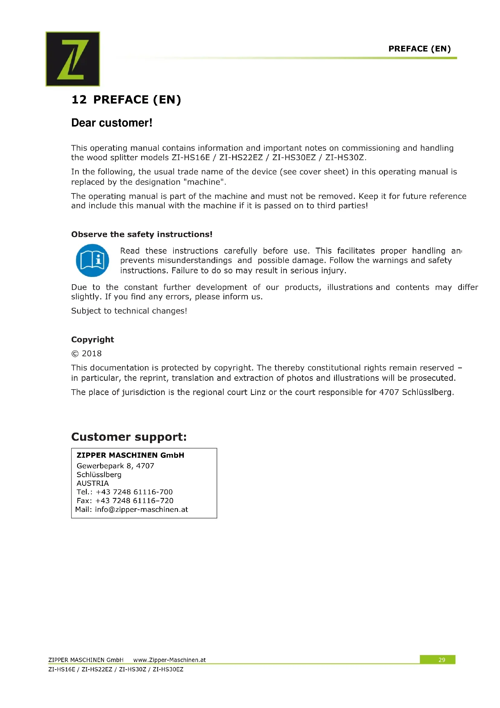 Sämtliche Reparaturen an dieser Maschine müssen von einem Spezialisten für dieses Produkt durchgeführt werden!PREFACE (EN) ZIPPER MASCHINEN GmbH www.Zipper-Maschinen.at 29 ZI-HS16E / ZI-HS22EZ / ZI-HS30Z / ZI-HS30EZ 12 PREFACE (EN) Dear customer! This operating manual contains information and important notes on commissioning and handling the wood splitter models ZI-HS16E / ZI-HS22EZ / ZI-HS30EZ / ZI-HS30Z. In the following, the usual trade name of the device (see cover sheet) in this operating manual is replaced by the designation "machine". The operating manual is part of the machine and must not be removed. Keep it for future reference and include this manual with the machine if it is passed on to third parties! Observe the safety instructions!