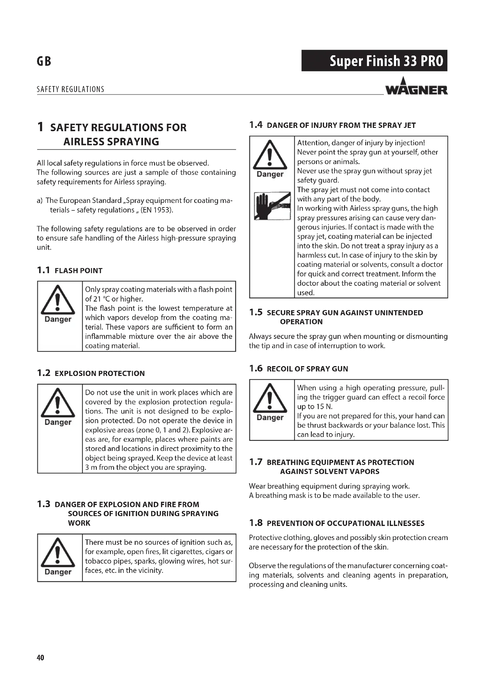 Never bring ngers, hands or other body parts into contact with the spray jet!Never point the spray gun at yourself, other persons or animals. Never use the spray gun without spray jet safety guard.Do not treat a spray injury as a harmless cut. In case of injury to the skin by coating material or solvents, consult a doctor for quick and correct treatment. Inform the doctor about the coating material or solvent used. The following points are to be observed in accordance with the operating manual before every start-up:1. Faulty units may not be used.2. Secure a Wagner spray gun with the securing lever at the trigger guard.3. Ensure earthing.4. Check the permissible operating pressure of the high-pressure hose and spray gun.5. Check all the connecting parts for leaks. Instructions for regular cleaning and maintenance of the unit are to be observed strictly.Observe the following rules before any work on the unit and at every working break:1. Relieve the pressure from the spray gun and high-pressure hose.2. Secure a Wagner spray gun with the securing lever at the trigger guard3. Switch the unit o. WARNING! Attention, danger of injury by injection! Airless units develop extremely high spray pressures. Ensure safety!39 Super Finish 33 PRO