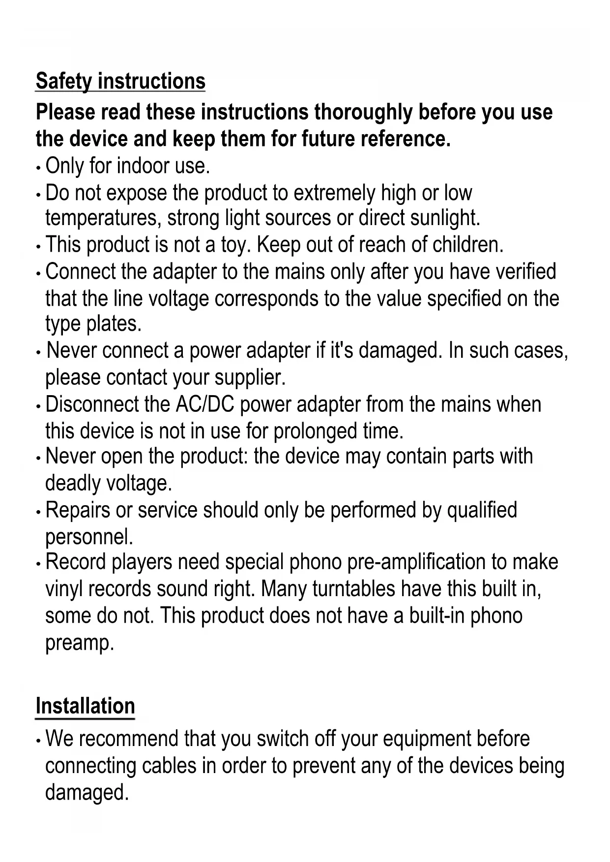 Package content 1x Audio converter 1x RCA (cinch) audio cable, 90 cm 1x 5V USB-A Power adapter 1x Power cable, black, 100 cm 1x Quick guide Connect AD12 Digital audio converter Convert your analogue stereo signal into a digital audio signalSafety instructions Please read these instructions thoroughly before you use the device and keep them for future reference.
