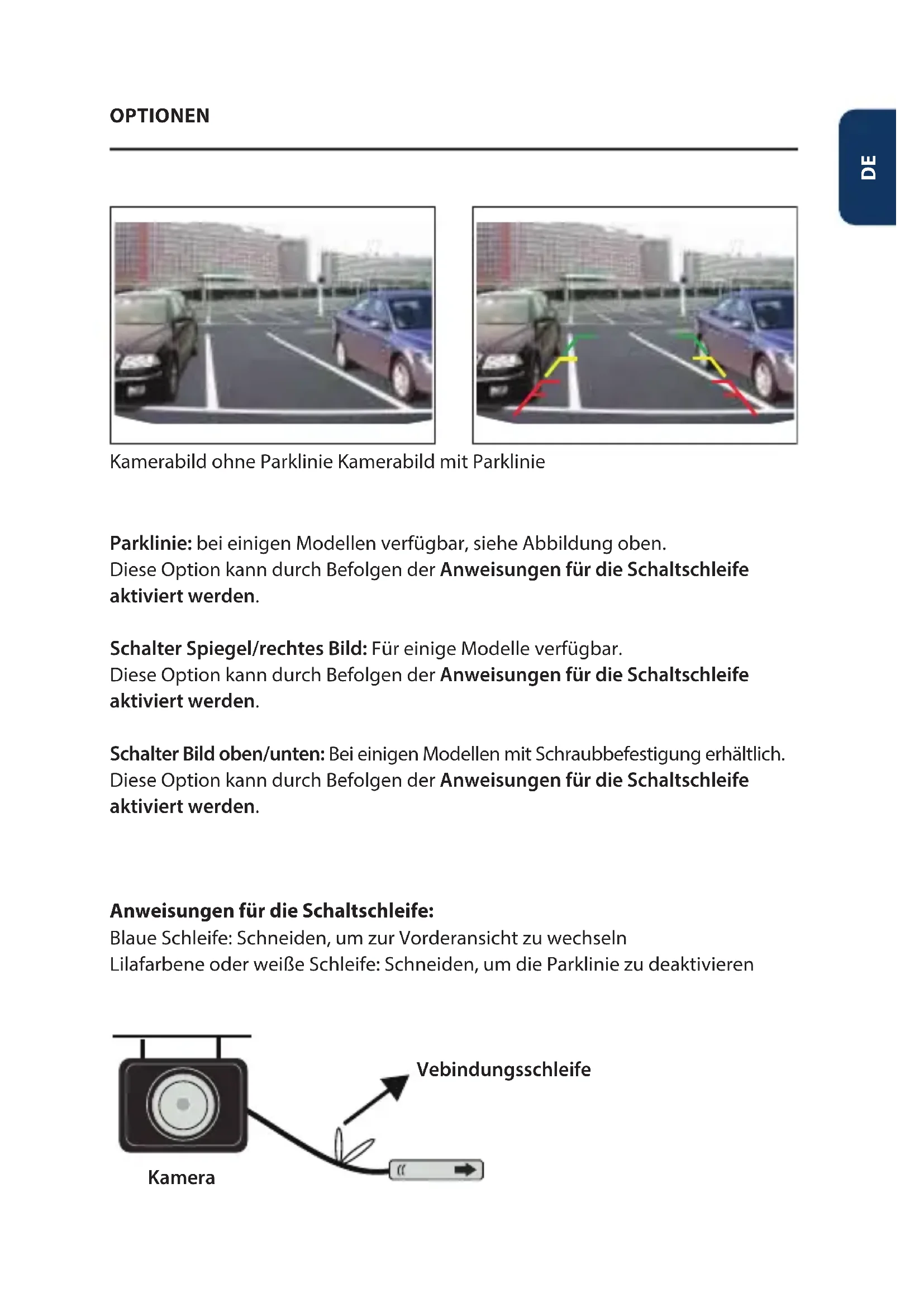 688X528 <40mA IP67 Storage temperature range -30℃ ~ +80℃ <0.35W KameraVebindungsschleife EEqquuaall DDiiaammeetteerr UUPP UUPP B. Installation Guide For Bracket-Mount Camera Blue loop: Cut to switch to front view Purple or white loop: Cut to turn off parking line Switch Loop Instructions: Wiring Diagram Remarks: Beside flush and bracket mount cameras, we also have bolt mount camera series, which is mounted by following steps: