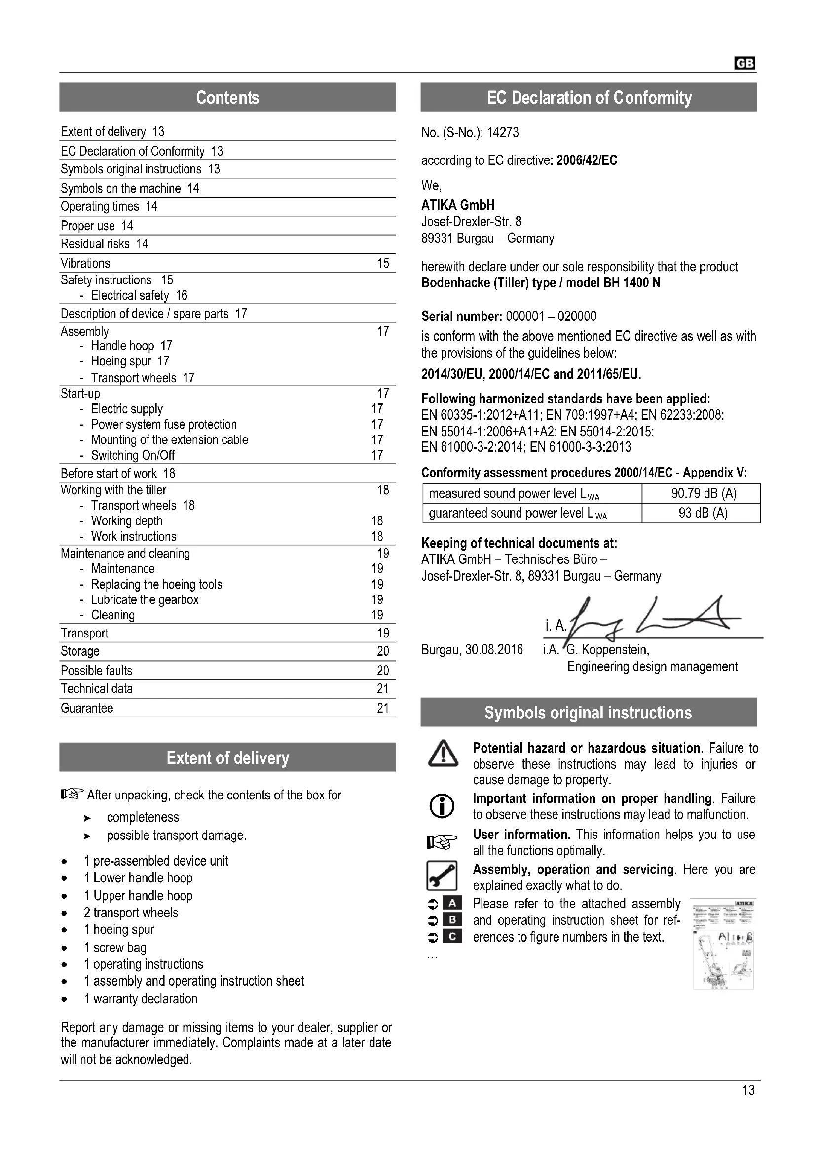 Extent of delivery 13 EC Declaration of Conformity 13 Symbols original instructions 13 Symbols on the machine 14 Operating times 14 Proper use 14 Residual risks 14 Vibrations 15 Safety instructions 15 - Electrical safety 16 Description of device / spare parts 17 Assembly 17 - Handle hoop 17 - Hoeing spur 17 - Transport wheels 17 Start-up 17 - Electric supply 17 - Power system fuse protection 17 - Mounting of the extension cable 17 - Switching On/Off 17 Before start of work 18 Working with the tiller 18 - Transport wheels 18 - Working depth 18 - Work instructions 18 Maintenance and cleaning 19 - Maintenance 19 - Replacing the hoeing tools 19 - Lubricate the gearbox 19 - Cleaning 19 Transport 19 Storage 20 Possible faults 20 Technical data 21 Guarantee 21