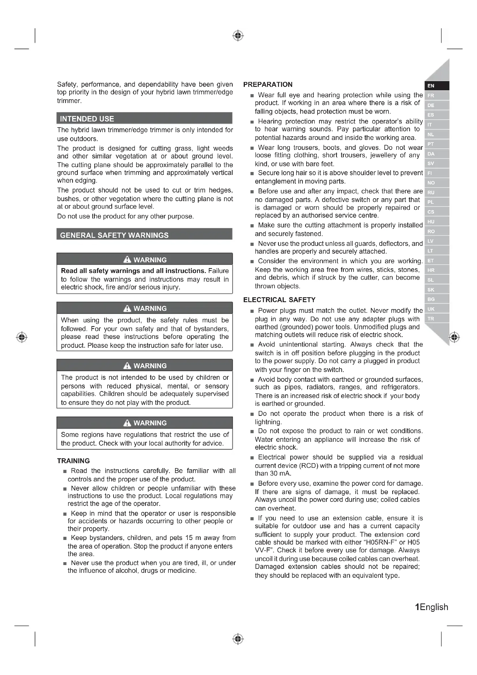 WARNING Read all safety warnings and all instructions. Failure to follow the warnings and instructions may result in electric shock, fi re and/or serious injury. WARNING When using the product, the safety rules must be followed. For your own safety and that of bystanders, please read these instructions before operating the product. Please keep the instruction safe for later use. WARNING The product is not intended to be used by children or persons with reduced physical, mental, or sensory capabilities. Children should be adequately supervised to ensure they do not play with the product. WARNING Some regions have regulations that restrict the use of the product. Check with your local authority for advice. TRAINING ■ Read the instructions carefully. Be familiar with all controls and the proper use of the product. ■ Never allow children or people unfamiliar with these instructions to use the product. Local regulations may restrict the age of the operator. ■ Keep in mind that the operator or user is responsible for accidents or hazards occurring to other people or their property. ■ Keep bystanders, children, and pets 15 m away from the area of operation. Stop the product if anyone enters the area. ■ Never use the product when you are tired, ill, or under the influence of alcohol, drugs or medicine. PREP ARATION ■ Wear full eye and hearing protection while using the product. If working in an area where there is a risk of falling objects, head protection must be worn. ■ Hearing protection may restrict the operator’s ability to hear warning sounds. Pay particular attention to potential hazards around and inside the working area. ■ Wear long trousers, boots, and gloves. Do not wear loose fitting clothing, short trousers, jewellery of any kind, or use with bare feet. ■ Secure long hair so it is above shoulder level to prevent entanglement in moving parts. ■ Before use and after any impact, check that there are no damaged parts. A defective switch or any part that is damaged or worn should be properly repaired or replaced by an authorised service centre. ■ Make sure the cutting attachment is properly installed and securely fastened. ■ Never use the product unless all guards, deflectors, and handles are properly and securely attached. ■ Consider the environment in which you are working. Keep the working area free from wires, sticks, stones, and debris, which if struck by the cutter, can become thrown objects. ELECTRICAL SAFETY ■ Power plugs must match the outlet. Never modify the plug in any way. Do not use any adapter plugs with earthed (grounded) power tools. Unmodified plugs and matching outlets will reduce risk of electric shock. ■ Avoid unintentional starting. Always check that the switch is in off position before plugging in the product to the power supply. Do not carry a plugged in product with your finger on the switch. ■ Avoid body contact with earthed or grounded surfaces, such as pipes, radiators, ranges, and refrigerators. There is an increased risk of electric shock if your body is earthed or grounded. ■ Do not operate the product when there is a risk of lightning. ■ Do not expose the product to rain or wet conditions. Water entering an appliance will increase the risk of electric shock. ■ Electrical power should be supplied via a residual current device (RCD) with a tripping current of not more than 30 mA. ■ Before every use, examine the power cord for damage. If there are signs of damage, it must be replaced. Always uncoil the power cord during use; coiled cables can overheat. ■ If you need to use an extension cable, ensure it is suitable for outdoor use and has a current capacity sufficient to supply your product. The extension cord cable should be marked with either “H05RN-F” or H05 VV-F”. Check it before every use for damage. Always uncoil it during use because coiled cables can overheat. Damaged extension cables should not be repaired; they should be replaced with an equivalent type.2 | English ■ Do not use the product if the electric cables are damaged or worn. ■ If the power cord or extension cable becomes damaged during use, disconnect from the power supply immediately. Do not touch the electric cables until the power supply has been disconnected. ■ Make sure the power cord is positioned so that it cannot be damaged by the cutting means and will not be stepped on, tripped over, or otherwise subjected to damage or stress. ■ Never pick up or carry the product by the electric cable. ■ Never pull by the power cord to disconnect from the power supply. ■ Keep the power cord away from heat, oil and sharp edges. ■ Make sure voltage is correct for your product. A nameplate on the product indicates the product’s voltage. Never connect the product to an AC voltage that differs from this voltage. ■ Make sure the switch is in off position before disconnecting from power supply.