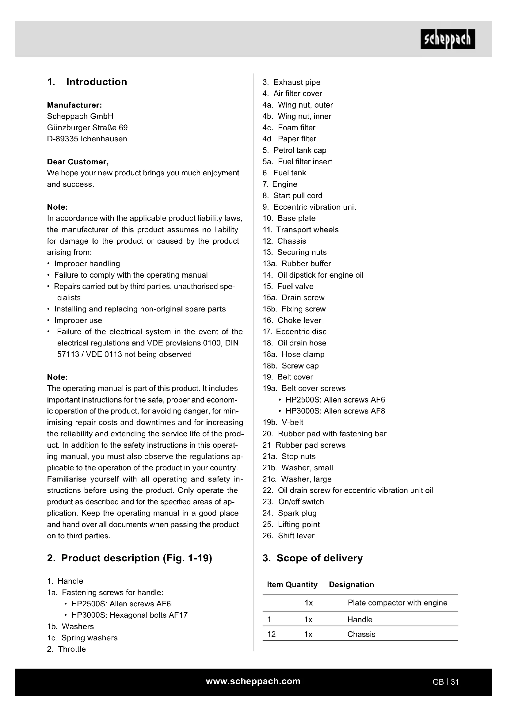 The plate compactor transfers forces to loose soil or other materials. It can be used for general road works, landscaping and building construction. The plate com- pactor increases the load-bearing capacity, reduces water permeability, prevents soil settling, reduces swelling or contraction of the soil. It is particularly suit- able for compacting interlocking pavers and trenches, as well as for landscaping and conservation work. m Attention! The plate compactor is not designed for use on adher- ent substrates such as clay or hard surfaces such as concrete. The machine may only be used in the intended manner. Any use beyond this is improper. The user/operator, not the manufacturer, is responsible for damages or inju- ries of any type resulting from this. An element of the intended use is also the observance of the safety instructions, as well as the assembly in- structions and operating information in the operating manual. Persons who operate and maintain the machine must be familiar with it and must be informed about potential dangers. In addition, the applicable accident prevention regula- tions must be strictly observed. Other general occupational health and safety-related rules and regulations must be observed. The liability of the manufacturer and resulting damages are excluded in the event of modications of the machine. The machine may only be operated with original parts and original accessories from the manufacturer. The safety, operating and maintenance specications of the manufacturer, as well as the dimensions specied in the technical data, must be observed. Please note that our equipment was not designed with the intention of use for commercial or industrial purpos- es. We assume no guarantee if the device is used in commercial or industrial applications, or for equivalent work.www.scheppach.com