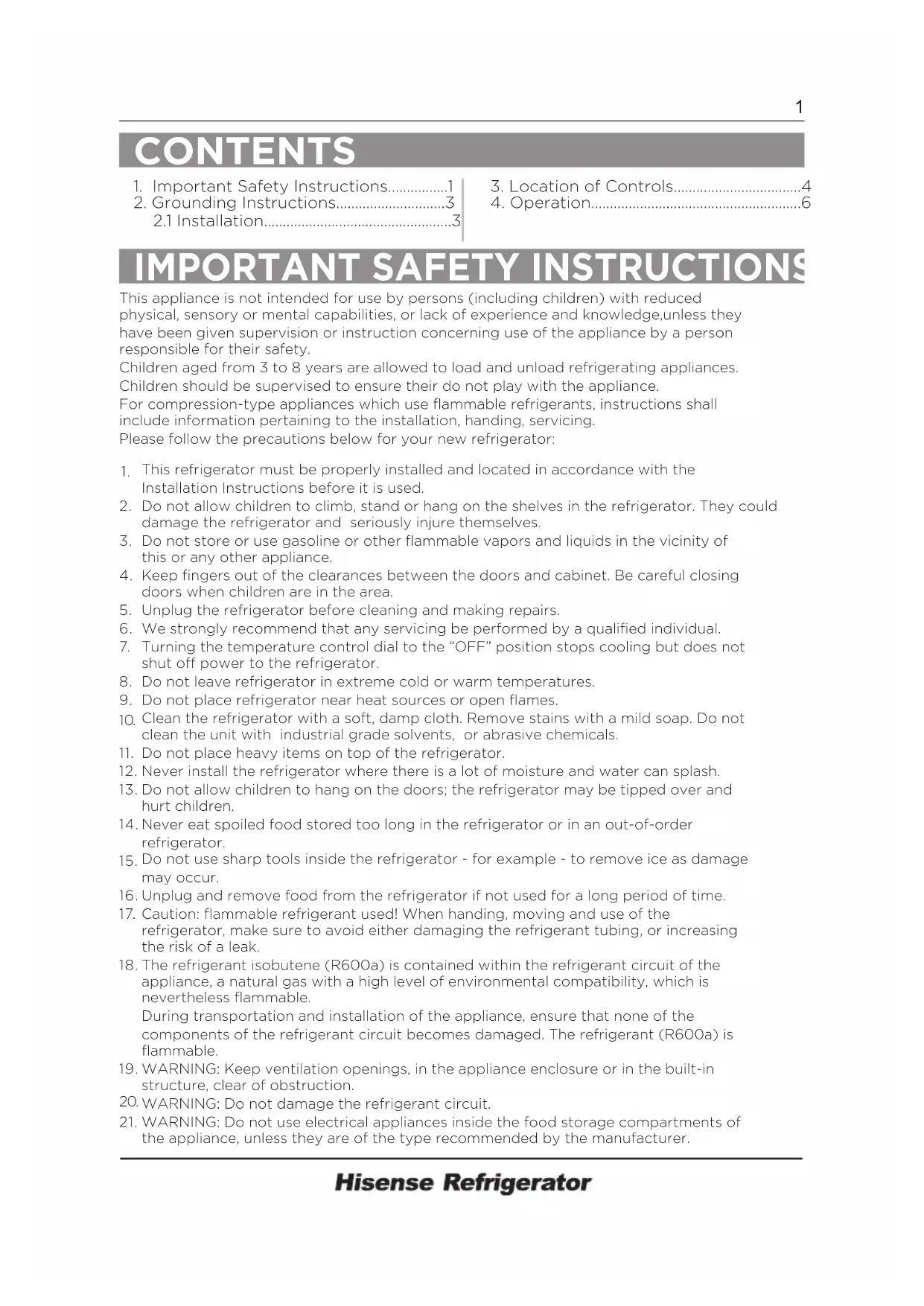 This appliance is not intended for use by persons (including children) with reduced physical, sensory or mental capabilities, or lack of experience and knowledge,unless they have been given supervision or instruction concerning use of the appliance by a person responsible for their safety. Children aged from 3 to 8 years are allowed to load and unload refrigerating appliances. Children should be supervised to ensure their do not play with the appliance. For compression-type appliances which use flammable refrigerants, instructions shall include information pertaining to the installation, handing, servicing. Please follow the precautions below for your new refrigerator: CONTENTS