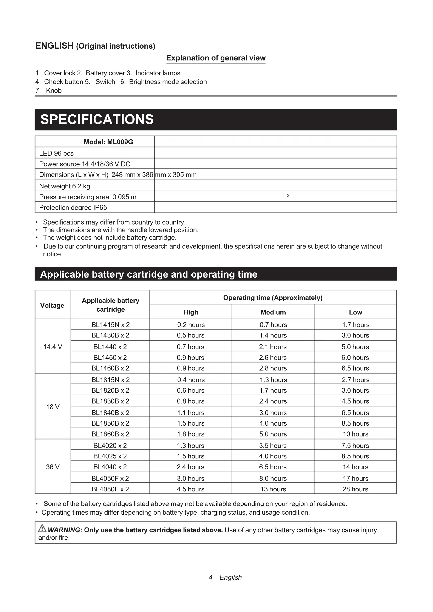 - Due to our continuing program of research and development, the specifications herein are subject to change without notice. Applicable battery cartridge and operating time Voltage Applicable battery cartridge Operating time (Approximately) High Medium Low