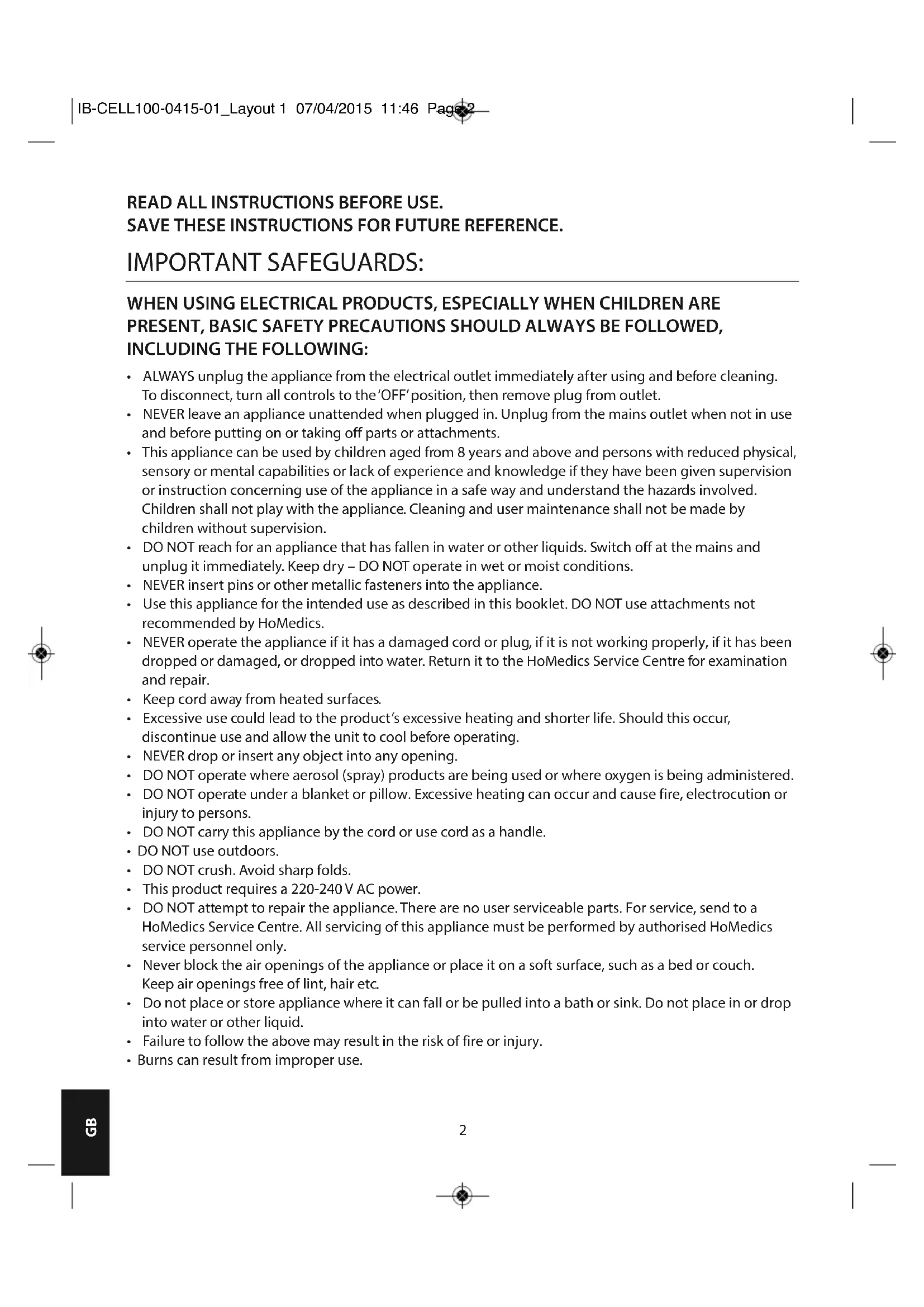 - Never use abrasive cleaners, brushes, glass / furniture polish, paint thinner etc to clean. Storage Place the appliance in its box or in a safe, dry, cool place. DO NOT wrap the power cord around the appliance. DO NOT hang the unit by the cord. IB-CELL100-0415-01_Layout 1 07/04/2015 11:46 Page 67