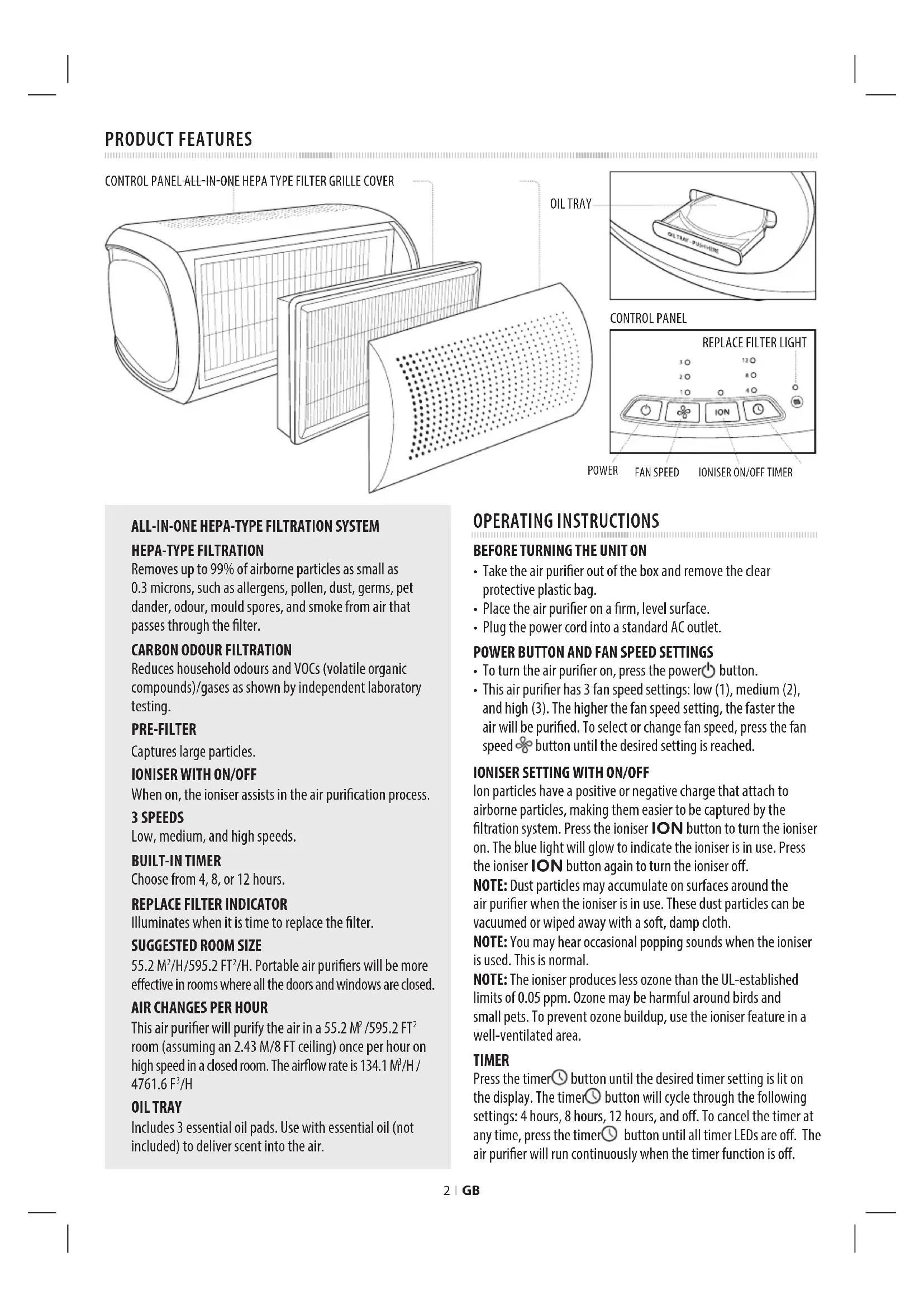When on, the ioniser assists in the air purication process. 3 SPEEDS Low, medium, and high speeds. BUILT-IN TIMER Choose from 4, 8, or 12 hours.