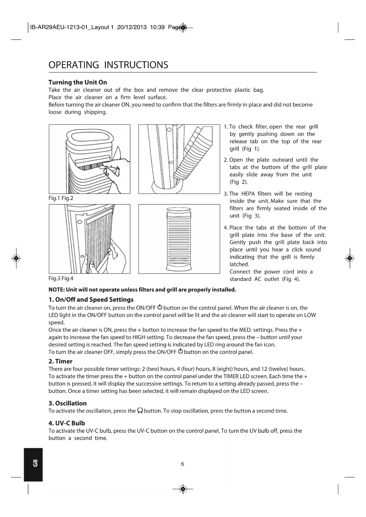 OPERATING INSTRUCTIONS Turning the Unit On Take the air cleaner out of the box and remove the clear protective plastic bag. Place the air cleaner on a firm level surface. Before turning the air cleaner ON, you need to confirm that the filters are firmly in place and did not become loose during shipping. NOTE: Unit will not operate unless filters and grill are properly installed.