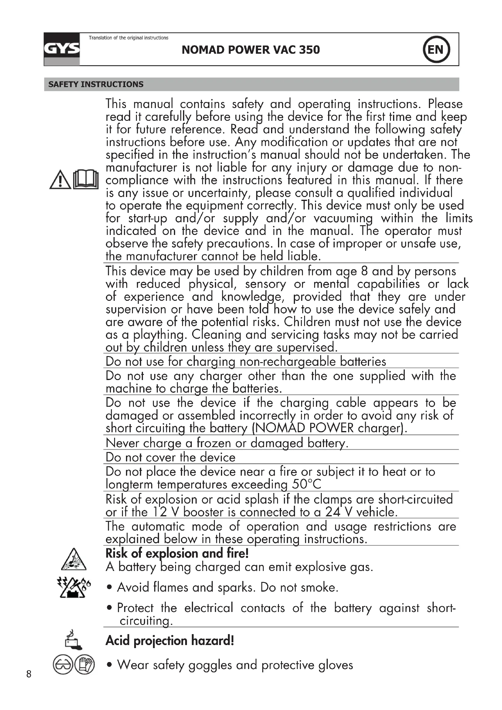 Notice originaleSAFETY INSTRUCTIONS This manual contains safety and operating instructions. Please read it carefully before using the device for the rst time and keep it for future reference. Read and understand the following safety instructions before use. Any modication or updates that are not specied in the instruction’s manual should not be undertaken. The manufacturer is not liable for any injury or damage due to non- compliance with the instructions featured in this manual. If there is any issue or uncertainty, please consult a qualied individual to operate the equipment correctly. This device must only be used for start-up and/or supply and/or vacuuming within the limits indicated on the device and in the manual. The operator must observe the safety precautions. In case of improper or unsafe use, the manufacturer cannot be held liable. This device may be used by children from age 8 and by persons with reduced physical, sensory or mental capabilities or lack of experience and knowledge, provided that they are under supervision or have been told how to use the device safely and are aware of the potential risks. Children must not use the device as a plaything. Cleaning and servicing tasks may not be carried out by children unless they are supervised. Do not use for charging non-rechargeable batteries Do not use any charger other than the one supplied with the machine to charge the batteries. Do not use the device if the charging cable appears to be damaged or assembled incorrectly in order to avoid any risk of short circuiting the battery (NOMAD POWER charger). Never charge a frozen or damaged battery. Do not cover the device Do not place the device near a re or subject it to heat or to longterm temperatures exceeding 50°C Risk of explosion or acid splash if the clamps are short-circuited or if the 12 V booster is connected to a 24 V vehicle. The automatic mode of operation and usage restrictions are explained below in these operating instructions. Risk of explosion and fire! A battery being charged can emit explosive gas.