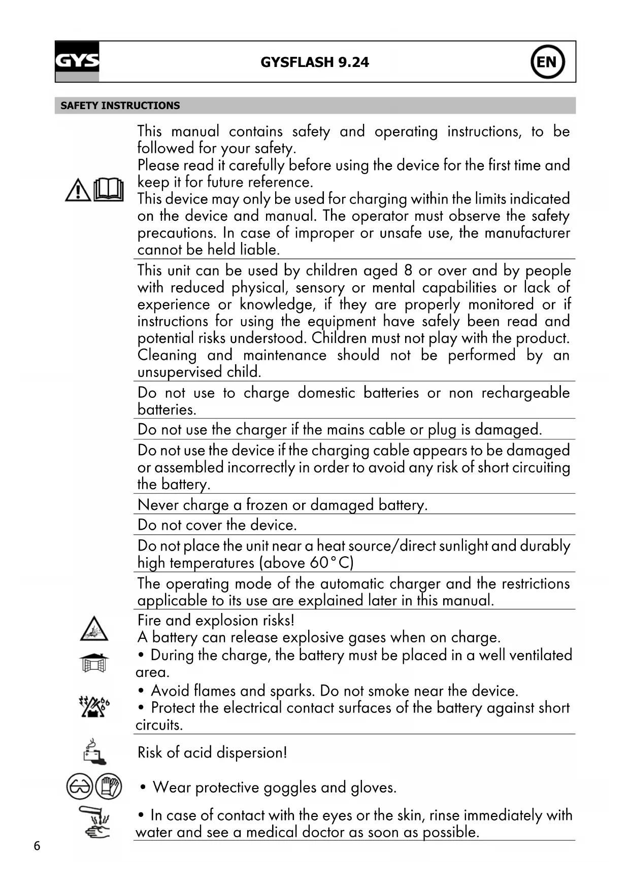 - This product should be disposed of at an appropriate recycling facility. Do not throw away in a household bin. GENERAL DESCRIPTION Your Gysash is ideal to charge most lead-acid batteries, often used for cars and many other vehicles. The GYSFLASH can be used safely for : GEL (gel electrolyte), AGM (Absorbant Glass Mat), EFB ( Enhanced Flooded Battery)WET, MF (Maintenance Free), CA (Calcium)... The Gysash 9.24 is designed to charge :- 6V batteries (3*2V elements) from 18Ah to 220Ah and yo to 300Ah for maintenance charge,- 12V batteries (6*2V elements) from 18Ah to 220Ah and up to 300Ah for maintenance charge,- 24V batteries (12*2V elements) from 15Ah to 125Ah and up to 170Ah for maintenance charge.8 GYSFLASH 9.24