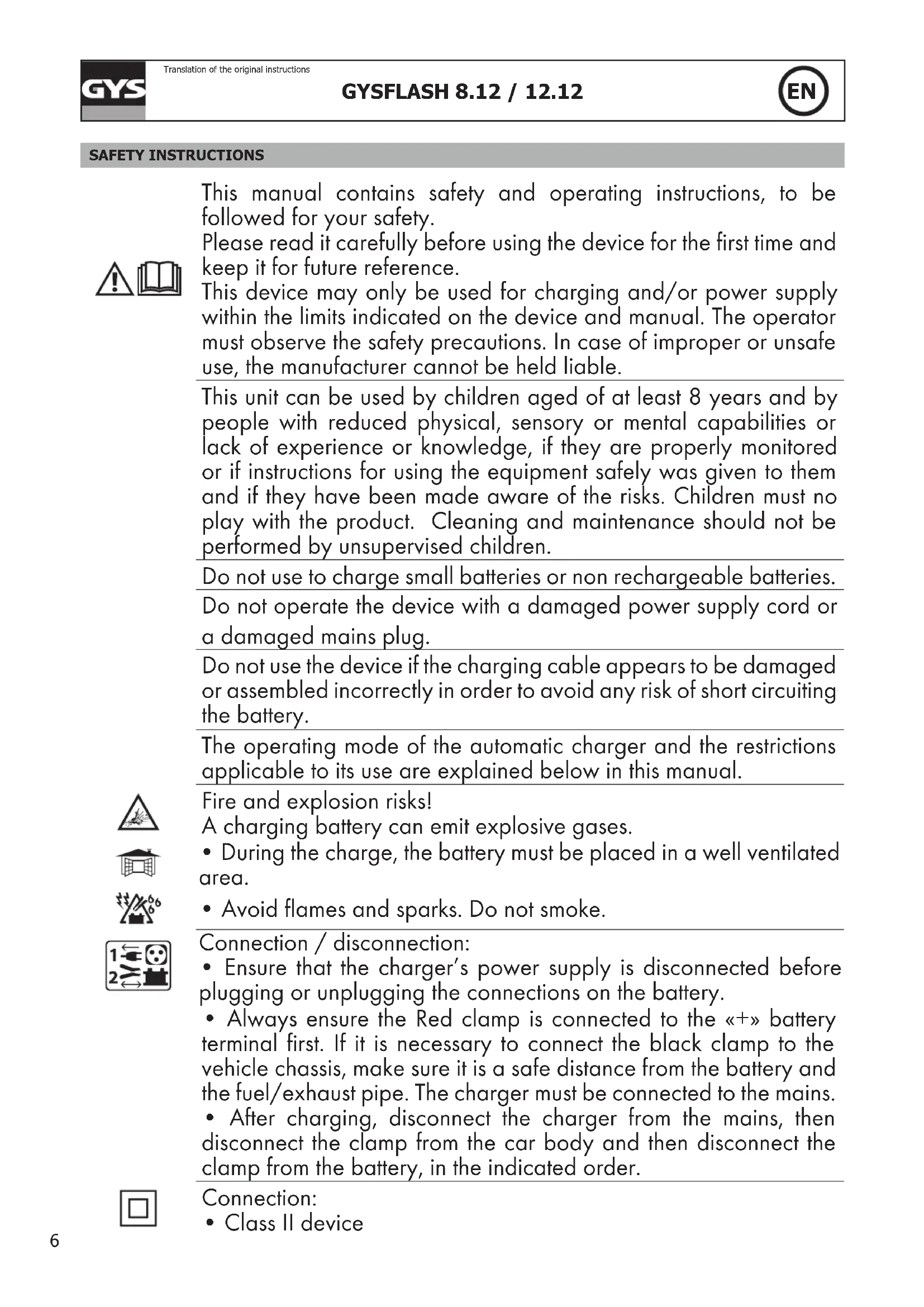 - This product should be disposed of at an appropriate recycling facility. Do not throw away in a domestic bin. GENERAL DESCRIPTION Your Gysash is ideal to charge most lead-acid batteries, often used for cars and many other vehicles. These batteries can be of many types ex: GEL (gel electrolyte), AGM (absorbed glass mat), WET, MF (Maintenance Free), CA (Calcium)... The Gysash 8.12 is designed to charge 12V batteries (6*2V elements) from 15Ah to 160Ah and up to 240Ah for oating charge. The Gysash 12.12 is designed to charge 12V batteries (6*2V elements) from 20Ah to 250Ah and up to 330Ah for oating charge. Its power supply mode (SUPPLY) provides current for demonstration vehicles and enables battery replacement without vehicle system’s memory loss.The GYSFLASH 12.12 is tted with an integrated temperature probe that ensures that the voltage output is adapted to the ambient temperature. This adjustment is done in charge or in supply mode, it ensures a highly precise charge adapted to the ambient temperature. START UP 1. Connect the charger to the battery.2. Plug the charger to the mains (single phase 220-240Vac 50-60Hz). 3. Select the mode by pressing the button. After roughly 5 seconds, the charge starts automatically.4. During the charge, the device indicates the charge’s progress. When the indicator blinks, the battery is ready to start the vehicle. Once the indicator stays on, the battery is completely charged.5. The charge can be interrupted at any time by unplugging the mains plug or pressing the button.6. After charging, disconnect the charger from the mains, then disconnect the charger’s connections from the battery.8 GYSFLASH 8.12 / 12.12