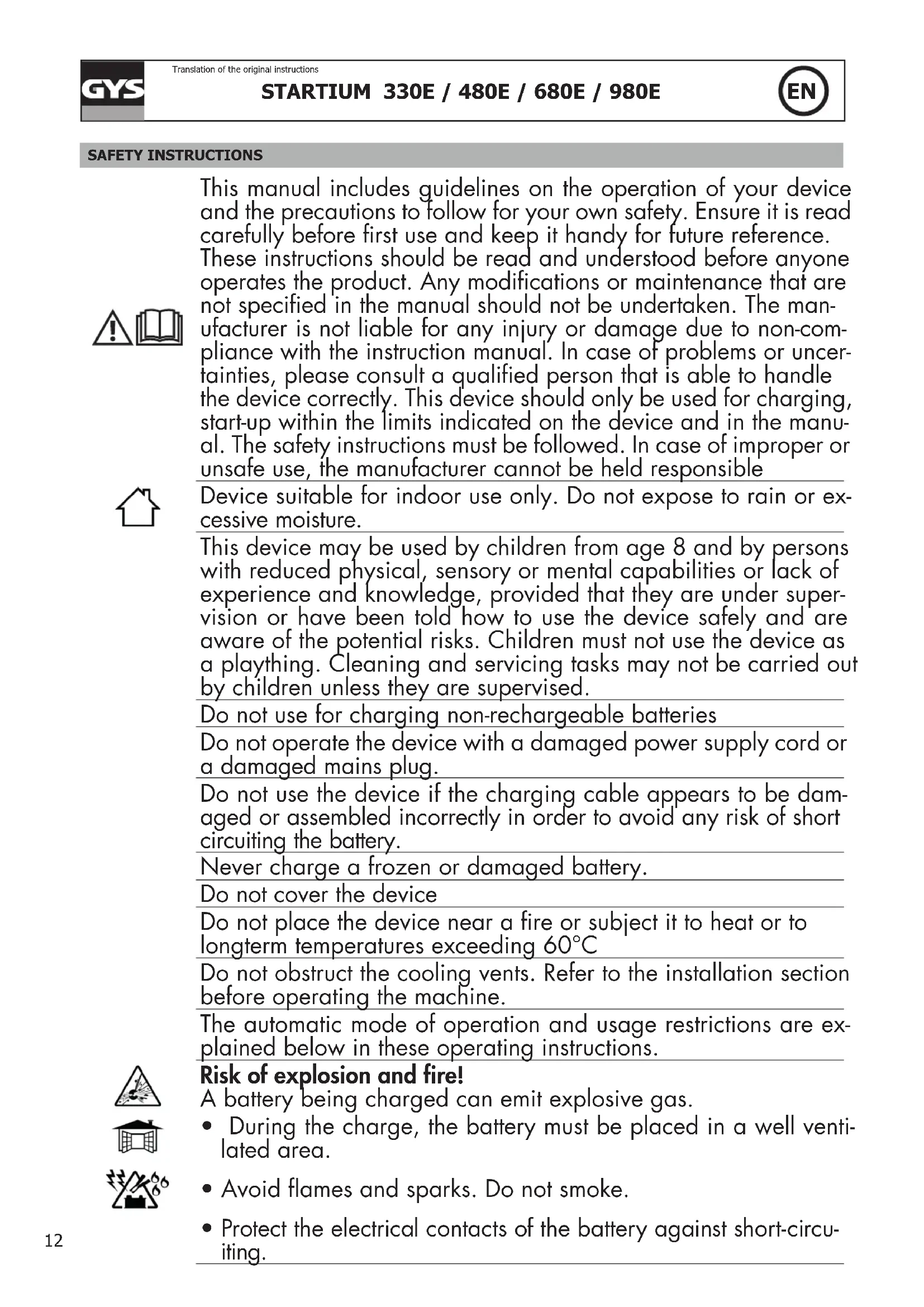 Translation of the original instructions SAFETY INSTRUCTIONS This manual includes guidelines on the operation of your device and the precautions to follow for your own safety. Ensure it is read carefully before rst use and keep it handy for future reference. These instructions should be read and understood before anyone operates the product. Any modications or maintenance that are not specied in the manual should not be undertaken. The man- ufacturer is not liable for any injury or damage due to non-com- pliance with the instruction manual. In case of problems or uncer- tainties, please consult a qualied person that is able to handle the device correctly. This device should only be used for charging, start-up within the limits indicated on the device and in the manu- al. The safety instructions must be followed. In case of improper or unsafe use, the manufacturer cannot be held responsible Device suitable for indoor use only. Do not expose to rain or ex- cessive moisture. This device may be used by children from age 8 and by persons with reduced physical, sensory or mental capabilities or lack of experience and knowledge, provided that they are under super- vision or have been told how to use the device safely and are aware of the potential risks. Children must not use the device as a plaything. Cleaning and servicing tasks may not be carried out by children unless they are supervised. Do not use for charging non-rechargeable batteries Do not operate the device with a damaged power supply cord or a damaged mains plug. Do not use the device if the charging cable appears to be dam- aged or assembled incorrectly in order to avoid any risk of short circuiting the battery. Never charge a frozen or damaged battery. Do not cover the device Do not place the device near a re or subject it to heat or to longterm temperatures exceeding 60°C Do not obstruct the cooling vents. Refer to the installation section before operating the machine. The automatic mode of operation and usage restrictions are ex- plained below in these operating instructions. Risk of explosion and fire! A battery being charged can emit explosive gas.