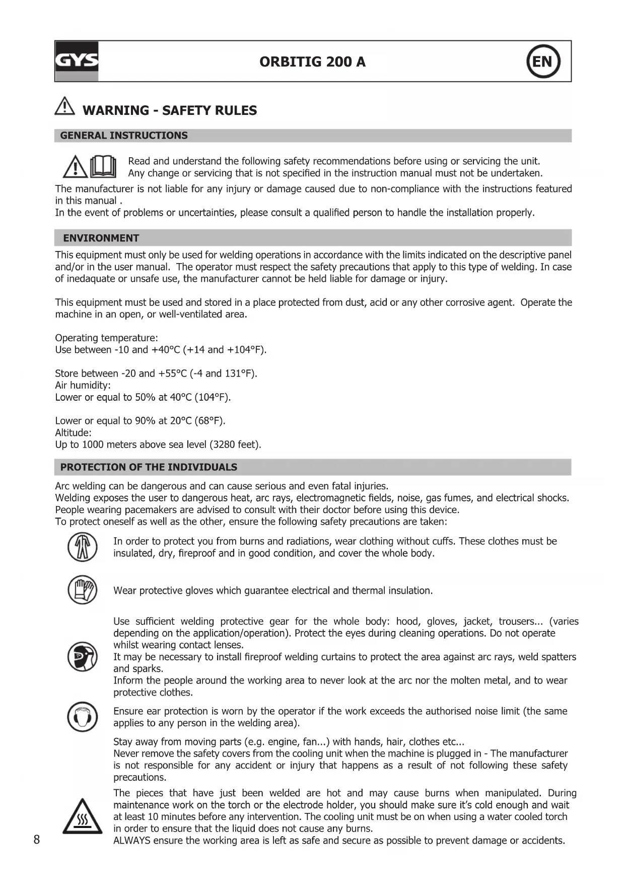 Arc welding can be dangerous and can cause serious and even fatal injuries. Welding exposes the user to dangerous heat, arc rays, electromagnetic elds, noise, gas fumes, and electrical shocks. People wearing pacemakers are advised to consult with their doctor before using this device. To protect oneself as well as the other, ensure the following safety precautions are taken: In order to protect you from burns and radiations, wear clothing without cus. These clothes must be insulated, dry, reproof and in good condition, and cover the whole body. Wear protective gloves which guarantee electrical and thermal insulation. Use sucient welding protective gear for the whole body: hood, gloves, jacket, trousers... (varies depending on the application/operation). Protect the eyes during cleaning operations. Do not operate whilst wearing contact lenses. It may be necessary to install reproof welding curtains to protect the area against arc rays, weld spatters and sparks. Inform the people around the working area to never look at the arc nor the molten metal, and to wear protective clothes. Ensure ear protection is worn by the operator if the work exceeds the authorised noise limit (the same applies to any person in the welding area). Stay away from moving parts (e.g. engine, fan...) with hands, hair, clothes etc... Never remove the safety covers from the cooling unit when the machine is plugged in - The manufacturer is not responsible for any accident or injury that happens as a result of not following these safety precautions. The pieces that have just been welded are hot and may cause burns when manipulated. During maintenance work on the torch or the electrode holder, you should make sure it’s cold enough and wait at least 10 minutes before any intervention. The cooling unit must be on when using a water cooled torch in order to ensure that the liquid does not cause any burns. ALWAYS ensure the working area is left as safe and secure as possible to prevent damage or accidents.9 ORBITIG 200 A