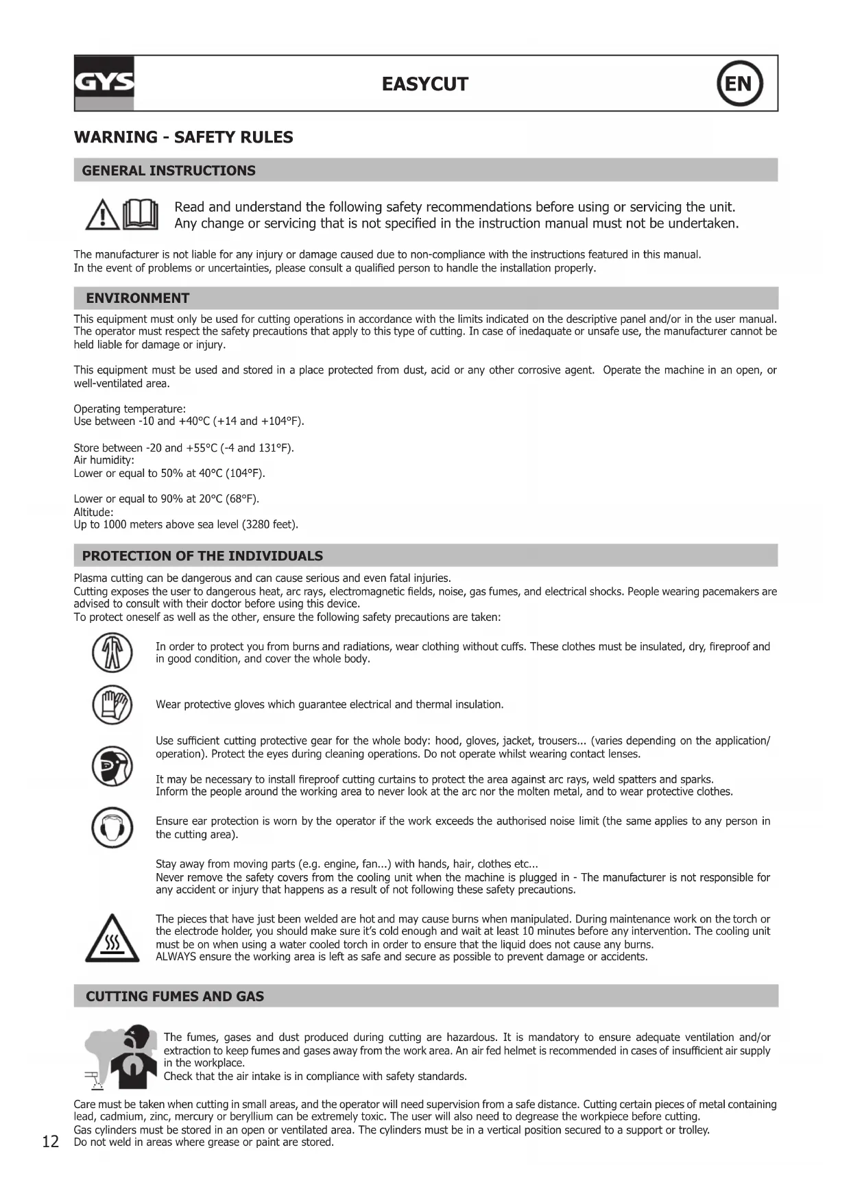 GENERAL INSTRUCTIONS Read and understand the following safety recommendations before using or servicing the unit. Any change or servicing that is not specied in the instruction manual must not be undertaken. The manufacturer is not liable for any injury or damage caused due to non-compliance with the instructions featured in this manual. In the event of problems or uncertainties, please consult a qualied person to handle the installation properly. ENVIRONMENT This equipment must only be used for cutting operations in accordance with the limits indicated on the descriptive panel and/or in the user manual. The operator must respect the safety precautions that apply to this type of cutting. In case of inedaquate or unsafe use, the manufacturer cannot be held liable for damage or injury. This equipment must be used and stored in a place protected from dust, acid or any other corrosive agent. Operate the machine in an open, or well-ventilated area. Operating temperature: Use between -10 and +40°C (+14 and +104°F). Store between -20 and +55°C (-4 and 131°F). Air humidity: Lower or equal to 50% at 40°C (104°F). Lower or equal to 90% at 20°C (68°F). Altitude: Up to 1000 meters above sea level (3280 feet).