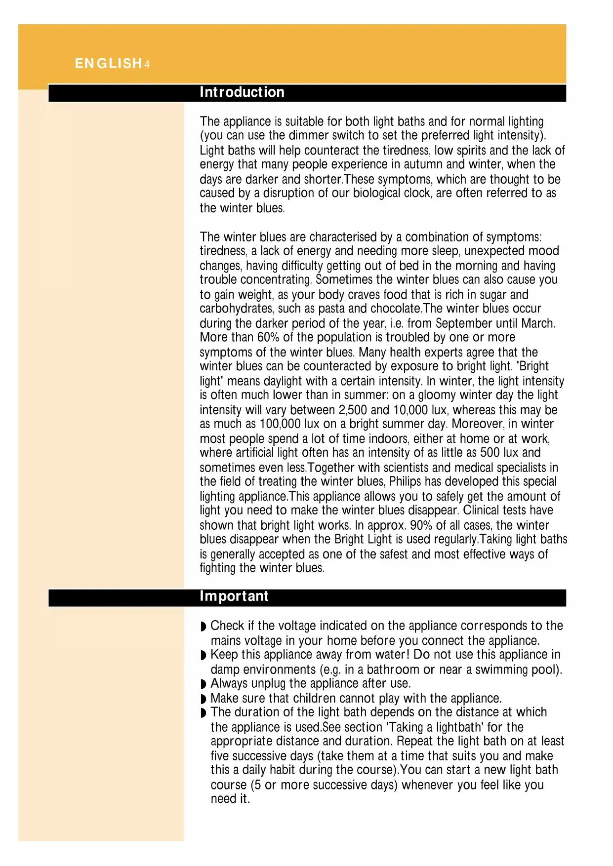 Bright Light Energy HF3305ENGLISH 4 DEUTSCH 9 FRANCAIS 14 NEDERLANDS 19 ITALIANO 24 NORSK 29 SVENSKA 34 SUOMI 39 DANSK 44 HF3305 3Introduction The appliance is suitable for both light baths and for normal lighting (you can use the dimmer switch to set the preferred light intensity). Light baths will help counteract the tiredness, low spirits and the lack of energy that many people experience in autumn and winter, when the days are darker and shorter.These symptoms, which are thought to be caused by a disruption of our biological clock, are often referred to as the winter blues. The winter blues are characterised by a combination of symptoms: tiredness, a lack of energy and needing more sleep, unexpected mood changes, having difficulty getting out of bed in the morning and having trouble concentrating. Sometimes the winter blues can also cause you to gain weight, as your body craves food that is rich in sugar and carbohydrates, such as pasta and chocolate.The winter blues occur during the darker period of the year, i.e. from September until March. More than 60% of the population is troubled by one or more symptoms of the winter blues. Many health experts agree that the winter blues can be counteracted by exposure to bright light. 'Bright light' means daylight with a certain intensity. In winter, the light intensity is often much lower than in summer: on a gloomy winter day the light intensity will vary between 2,500 and 10,000 lux, whereas this may be as much as 100,000 lux on a bright summer day. Moreover, in winter most people spend a lot of time indoors, either at home or at work, where artificial light often has an intensity of as little as 500 lux and sometimes even less.Together with scientists and medical specialists in the field of treating the winter blues, Philips has developed this special lighting appliance.This appliance allows you to safely get the amount of light you need to make the winter blues disappear. Clinical tests have shown that bright light works. In approx. 90% of all cases, the winter blues disappear when the Bright Light is used regularly.Taking light baths is generally accepted as one of the safest and most effective ways of fighting the winter blues. Important ◗ Check if the voltage indicated on the appliance corresponds to the mains voltage in your home before you connect the appliance. ◗ Keep this appliance away from water! Do not use this appliance in damp environments (e.g. in a bathroom or near a swimming pool). ◗ Always unplug the appliance after use. ◗ Make sure that children cannot play with the appliance. ◗ The duration of the light bath depends on the distance at which the appliance is used.See section 'Taking a lightbath' for the appropriate distance and duration. Repeat the light bath on at least five successive days (take them at a time that suits you and make this a daily habit during the course).You can start a new light bath course (5 or more successive days) whenever you feel like you need it. ENGLISH4◗ Use the light of this appliance as an addition to the normal light (sunlight, electric light) in your home. Do not use the appliance in a room that is not illuminated by any other light source. ◗ It is not advisable to look into the light too long. ◗ After the first few lightbaths you may experience some eye strain and/or a light headache.These side effects tend to disappear quickly. ◗ Consult your doctor before you start using the Bright Light if: - you (have) suffer(ed) from severe depression; - you are hypersensitive to light (e.g. diabetics and epileptics); - you have eye complaints; - you are on specific medication (i.e. certain antidepressants, psychotropic drugs or malaria tablets); - you have high blood pressure. ◗ If using the appliance causes you to become too active, we advise you to reduce the light dose. If there is no improvement,we advise you to consult your doctor. ◗ If you feel exhausted, distressed or restless and/or suffer from sleeping problems (e.g. insomnia) after having used the appliance, it is always advisable to consult your doctor or psychotherapist. Preparing the appliance for use 1 Place the appliance on a table top.