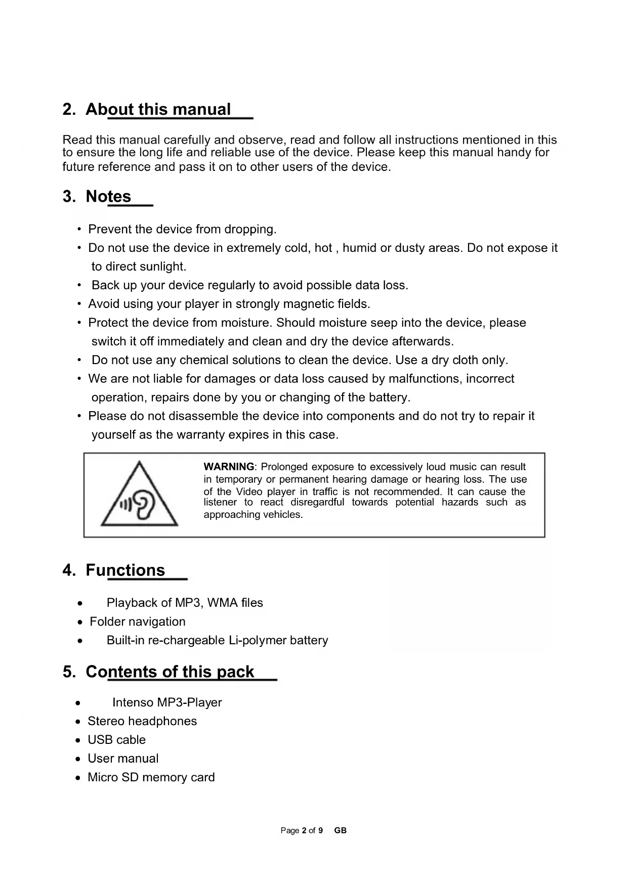 Please assure that the Micro SD card supplied is inserted. Connect to the PC Please proceed as follows: (1) Connect the player with the USB-port of the PC (2) The window "Intenso" opens. Now you can store the data from your hard disk on the player. Safe removal from PC For Windows 7 / 8 / 8.1 / 10: Click with the right mouse button bottom right in the task bar onto the symbol "safe removal of hardware". Select "remove USB flash drive" with the left mouse button from the appearing context menu. Please ensure that the data transfer has been finished completely. Now you can remove the device. Charging the battery: The device has a built-in re-chargeable Li-polymer battery. The battery is charged via the USB connection to your PC. Before using the device for the first time, please make sure that the battery is fully charged. This usually takes about 3 hours. Note: for optimum performance, the re-chargeable Li-polymer battery must be used regularly. If this is not the case, fully charge the battery at least once per month.Page 4 of 9 GB Controls