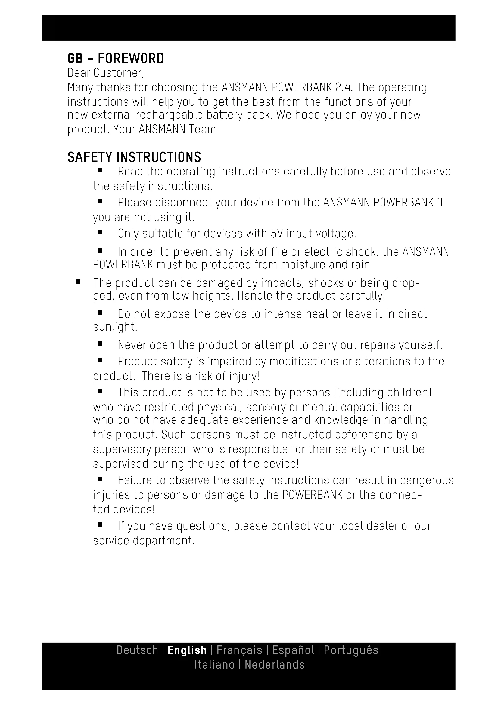 Dear Customer, Many thanks for choosing the ANSMANN POWERBANK 2.4. The operating instructions will help you to get the best from the functions of your new external rechargeable battery pack. We hope you enjoy your new product. Your ANSMANN Team SAFETY INSTRUCTIONS Read the operating instructions carefully before use and observe the safety instructions. Please disconnect your device from the ANSMANN POWERBANK if you are not using it. Only suitable for devices with 5V input voltage. In order to prevent any risk of fire or electric shock, the ANSMANN POWERBANK must be protected from moisture and rain! The product can be damaged by impacts, shocks or being drop- ped, even from low heights. Handle the product carefully! Do not expose the device to intense heat or leave it in direct sunlight! Never open the product or attempt to carry out repairs yourself! Product safety is impaired by modifications or alterations to the product. There is a risk of injury! This product is not to be used by persons (including children) who have restricted physical, sensory or mental capabilities or who do not have adequate experience and knowledge in handling this product. Such persons must be instructed beforehand by a supervisory person who is responsible for their safety or must be supervised during the use of the device! Failure to observe the safety instructions can result in dangerous injuries to persons or damage to the POWERBANK or the connec- ted devices! If you have questions, please contact your local dealer or our service department. Deutsch | English | Français | Español | Português Italiano | NederlandsUSE Capacity display Press the On/Off button to check the energy remaining. LED illuminates: 25% - 100% LED flashes: 1% - 25% NO LED ILLUMINATES: The POWERBANK is completely discharged. Please charge the POWER- BANK immediately. If the POWERBANK will be unused for an extended period of time, it is necessary to charge it before storage in order to avoid the rechargeable battery being damaged. > CHARGING THE POWERBANK: Insert the Micro-USB plug of the USB cable into the Micro-USB socket on the POWERBANK and the USB plug into the USB port on a computer or a USB charger. The charge process starts automatically. The LED flashes during the charge process. As soon as the Powerbank is fully charged, this LED illuminates steadily. > CHARGING DEVICES: In order to charge a device, such as a smartphone for example, please use the USB cable supplied (provided that the Micro-USB plug fits your mobile device) or the original charge cable for your device. Insert the USB plug of the cable into the POWERBANK and the other end into your device. The charge process starts automatically. Please disconnect your device from the POWERBANK once the charge process is complete. The POWERBANK switches off automatically if it is not charging a device. Please note that the Powerbank cannot be charged and discharged simultaneously. The POWERBANK may heat up a little depending on the charge/ discharge current. TECHNICAL DATA