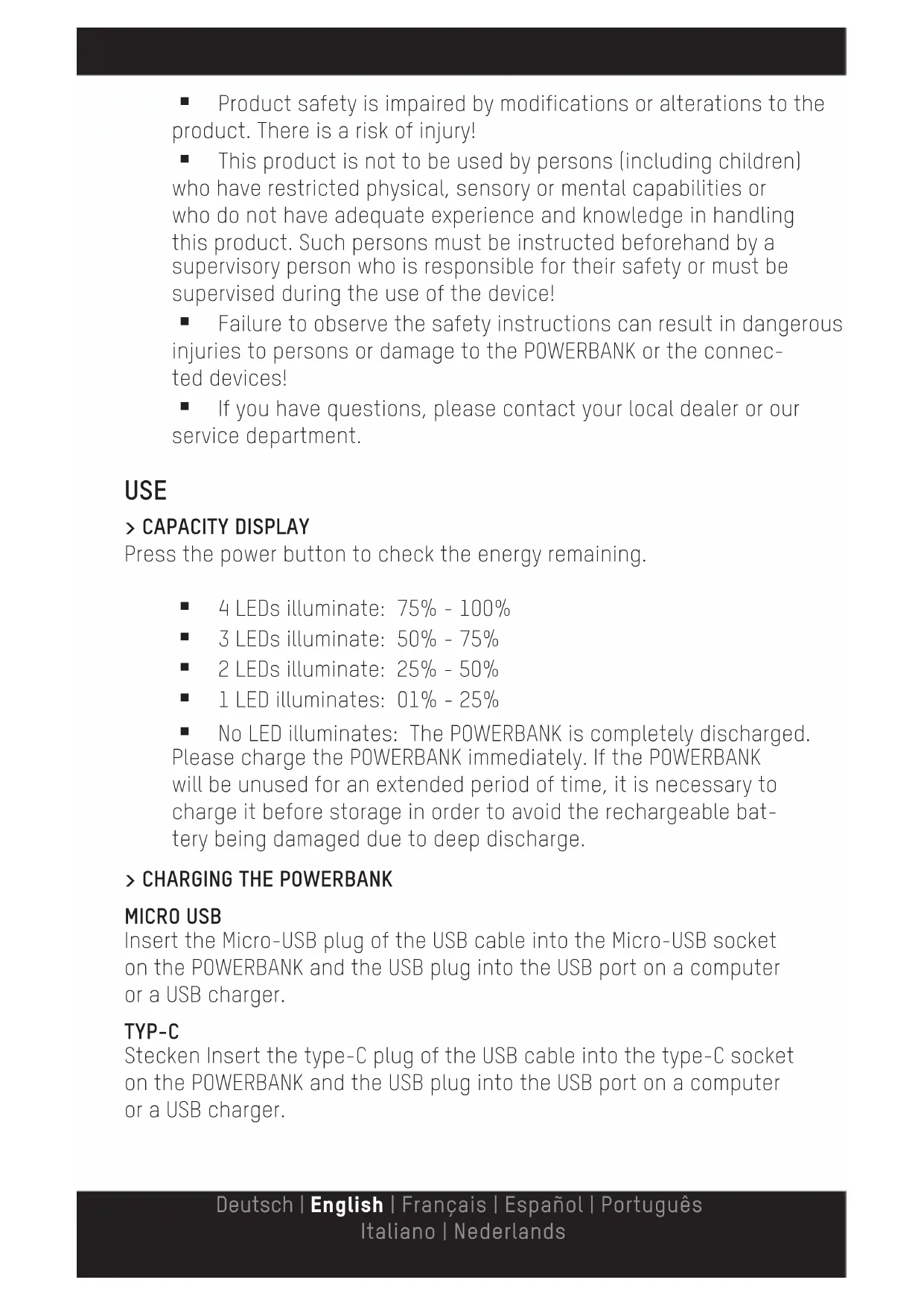 Read the operating instructions carefully before use and observe the safety instructions. Please disconnect your device from the ANSMANN POWERBANK if you are not using it. In order to prevent any risk of fire or electric shock, the ANSMANN POWERBANK must be protected from moisture and rain! The product can be damaged by impacts, shocks or being drop- ped, even from low heights. Handle the product carefully! Do not expose the device to intense heat or leave it in direct sunlight! Never open the product or attempt to carry out repairs yourself! Deutsch | English | Français | Español | Português Italiano | Nederlands Product safety is impaired by modifications or alterations to the product. There is a risk of injury! This product is not to be used by persons (including children) who have restricted physical, sensory or mental capabilities or who do not have adequate experience and knowledge in handling this product. Such persons must be instructed beforehand by a supervisory person who is responsible for their safety or must be supervised during the use of the device! Failure to observe the safety instructions can result in dangerous injuries to persons or damage to the POWERBANK or the connec- ted devices! If you have questions, please contact your local dealer or our service department. USE > CAPACITY DISPLAY Press the power button to check the energy remaining. 4 LEDs illuminate: 75% - 100% 3 LEDs illuminate: 50% - 75% 2 LEDs illuminate: 25% - 50% 1 LED illuminates: 01% - 25% No LED illuminates: The POWERBANK is completely discharged. Please charge the POWERBANK immediately. If the POWERBANK will be unused for an extended period of time, it is necessary to charge it before storage in order to avoid the rechargeable bat- tery being damaged due to deep discharge.