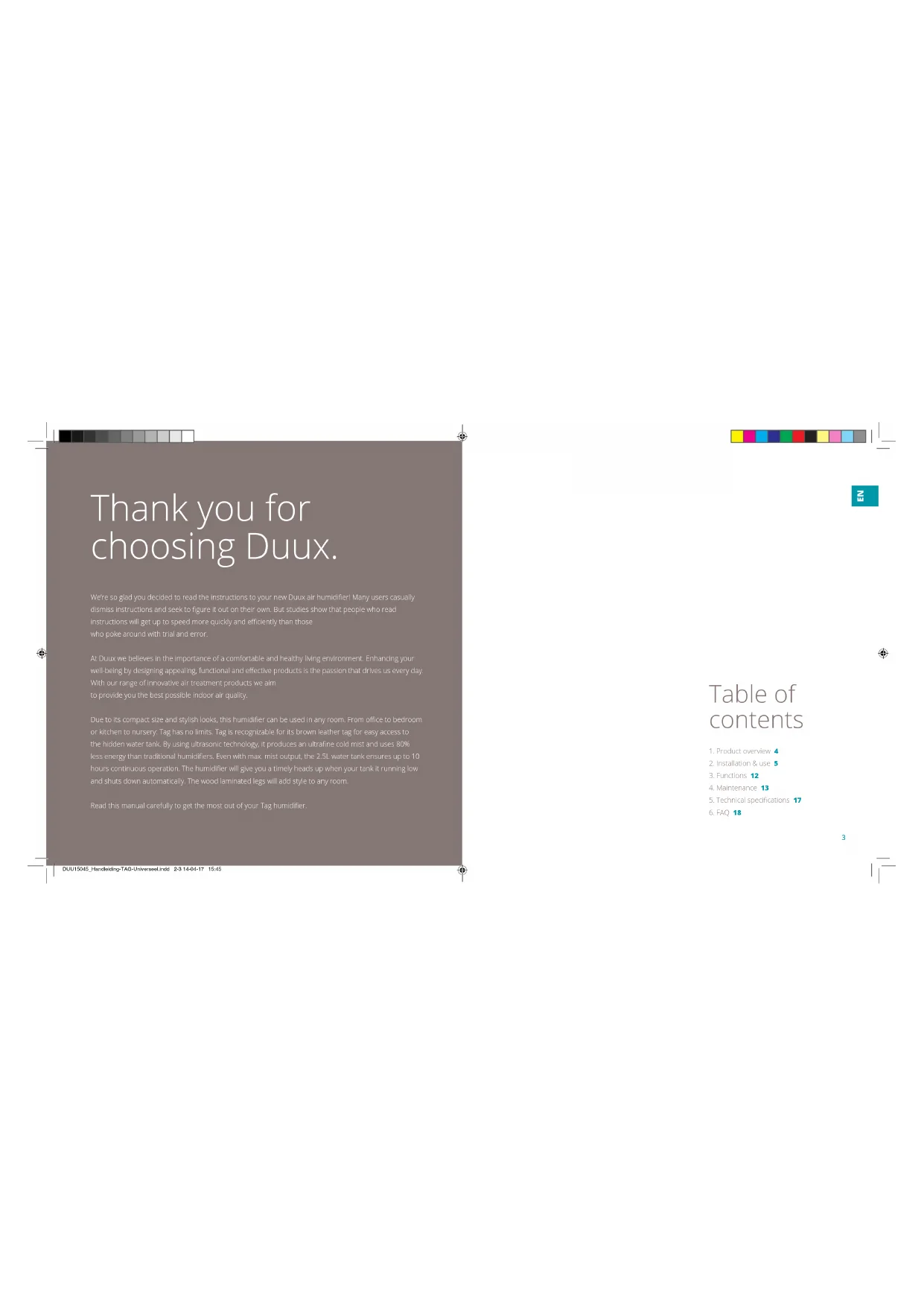 Tag ultrasonic humidier user manual | Bedienungsanleitung | gebruikershandleiding manuel d’utilisation | Instrukcja obsługi DUU15045_Handleiding-TAG-Universeel.indd 1 14-04-17 15:4532 Thank you for choosing Duux. We’re so glad you decided to read the instructions to your new Duux air humidier! Many users casually dismiss instructions and seek to gure it out on their own. But studies show that people who read instructions will get up to speed more quickly and eciently than those who poke around with trial and error. At Duux we believes in the importance of a comfortable and healthy living environment. Enhancing your well-being by designing appealing, functional and eective products is the passion that drives us every day. With our range of innovative air treatment products we aim to provide you the best possible indoor air quality. Due to its compact size and stylish looks, this humidier can be used in any room. From oce to bedroom or kitchen to nursery: Tag has no limits. Tag is recognizable for its brown leather tag for easy access to the hidden water tank. By using ultrasonic technology, it produces an ultrane cold mist and uses 80% less energy than traditional humidiers. Even with max. mist output, the 2.5L water tank ensures up to 10 hours continuous operation. The humidier will give you a timely heads up when your tank it running low and shuts down automatically. The wood laminated legs will add style to any room. Read this manual carefully to get the most out of your Tag humidier.