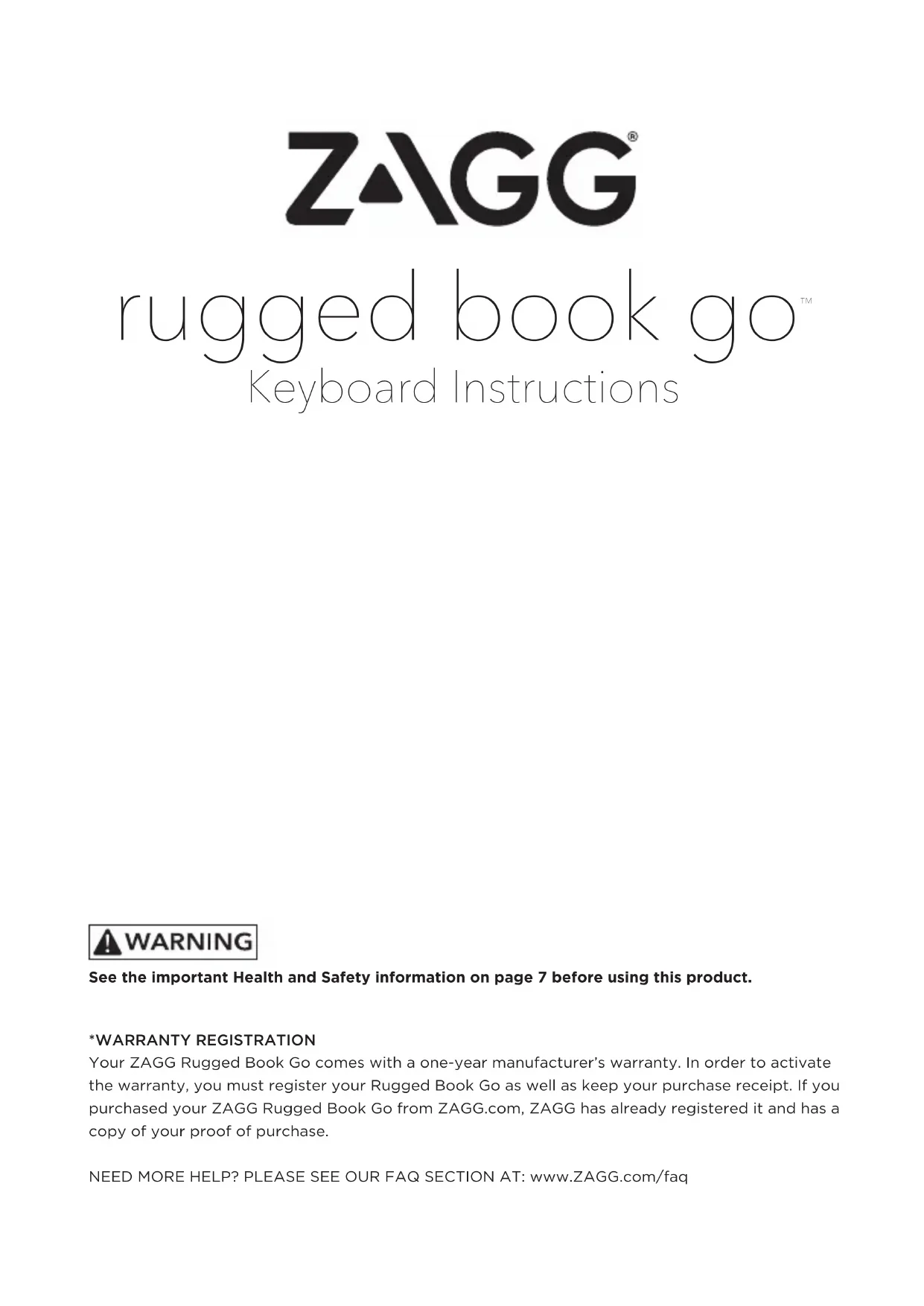 *WARRANTY REGISTRATION Your ZAGG Rugged Book Go comes with a one-year manufacturer’s warranty. In order to activate the warranty, you must register your Rugged Book Go as well as keep your purchase receipt. If you purchased your ZAGG Rugged Book Go from ZAGG.com, ZAGG has already registered it and has a copy of your proof of purchase. NEED MORE HELP? PLEASE SEE OUR FAQ SECTION AT: www.ZAGG.com/faq See the important Health and Safety information on page 7 before using this product.INSERTING/REMOVING YOUR DEVICE