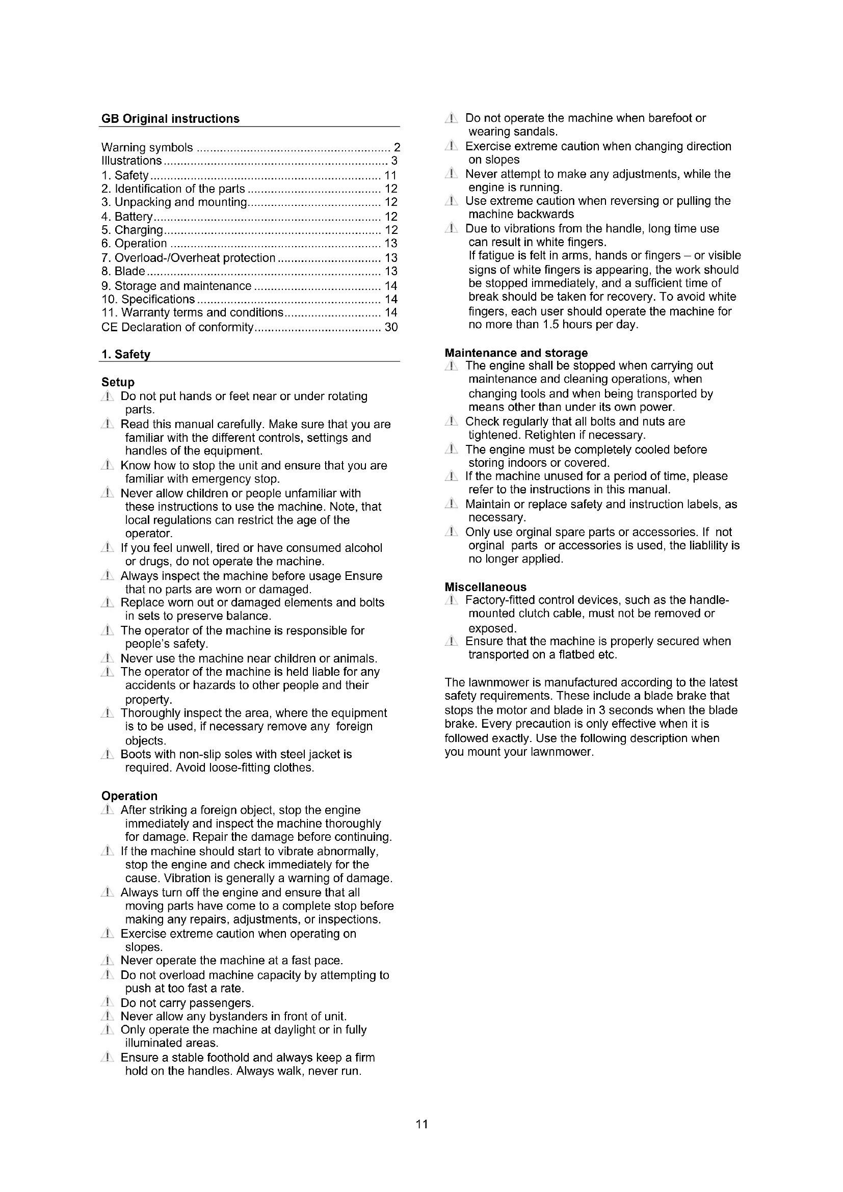 Setup Do not put hands or feet near or under rotating parts. Read this manual carefully. Make sure that you are familiar with the different controls, settings and handles of the equipment. Know how to stop the unit and ensure that you are familiar with emergency stop. Never allow children or people unfamiliar with these instructions to use the machine. Note, that local regulations can restrict the age of the operator. If you feel unwell, tired or have consumed alcohol or drugs, do not operate the machine. Always inspect the machine before usage Ensure that no parts are worn or damaged. Replace worn out or damaged elements and bolts in sets to preserve balance. The operator of the machine is responsible for people’s safety. Never use the machine near children or animals. The operator of the machine is held liable for any accidents or hazards to other people and their property. Thoroughly inspect the area, where the equipment is to be used, if necessary remove any foreign objects. Boots with non-slip soles with steel jacket is required. Avoid loose-fitting clothes. Operation After striking a foreign object, stop the engine immediately and inspect the machine thoroughly for damage. Repair the damage before continuing. If the machine should start to vibrate abnormally, stop the engine and check immediately for the cause. Vibration is generally a warning of damage. Always turn off the engine and ensure that all moving parts have come to a complete stop before making any repairs, adjustments, or inspections. Exercise extreme caution when operating on slopes. Never operate the machine at a fast pace. Do not overload machine capacity by attempting to push at too fast a rate. Do not carry passengers. Never allow any bystanders in front of unit. Only operate the machine at daylight or in fully illuminated areas. Ensure a stable foothold and always keep a firm hold on the handles. Always walk, never run. Do not operate the machine when barefoot or wearing sandals. Exercise extreme caution when changing direction on slopes Never attempt to make any adjustments, while the engine is running. Use extreme caution when reversing or pulling the machine backwards Due to vibrations from the handle, long time use can result in white fingers. If fatigue is felt in arms, hands or fingers – or visible signs of white fingers is appearing, the work should be stopped immediately, and a sufficient time of break should be taken for recovery. To avoid white fingers, each user should operate the machine for no more than 1.5 hours per day. Maintenance and storage The engine shall be stopped when carrying out maintenance and cleaning operations, when changing tools and when being transported by means other than under its own power. Check regularly that all bolts and nuts are tightened. Retighten if necessary. The engine must be completely cooled before storing indoors or covered. If the machine unused for a period of time, please refer to the instructions in this manual. Maintain or replace safety and instruction labels, as necessary. Only use orginal spare parts or accessories. If not orginal parts or accessories is used, the liablility is no longer applied. Miscellaneous Factory-fitted control devices, such as the handle- mounted clutch cable, must not be removed or exposed. Ensure that the machine is properly secured when transported on a flatbed etc. The lawnmower is manufactured according to the latest safety requirements. These include a blade brake that stops the motor and blade in 3 seconds when the blade brake. Every precaution is only effective when it is followed exactly. Use the following description when you mount your lawnmower.12