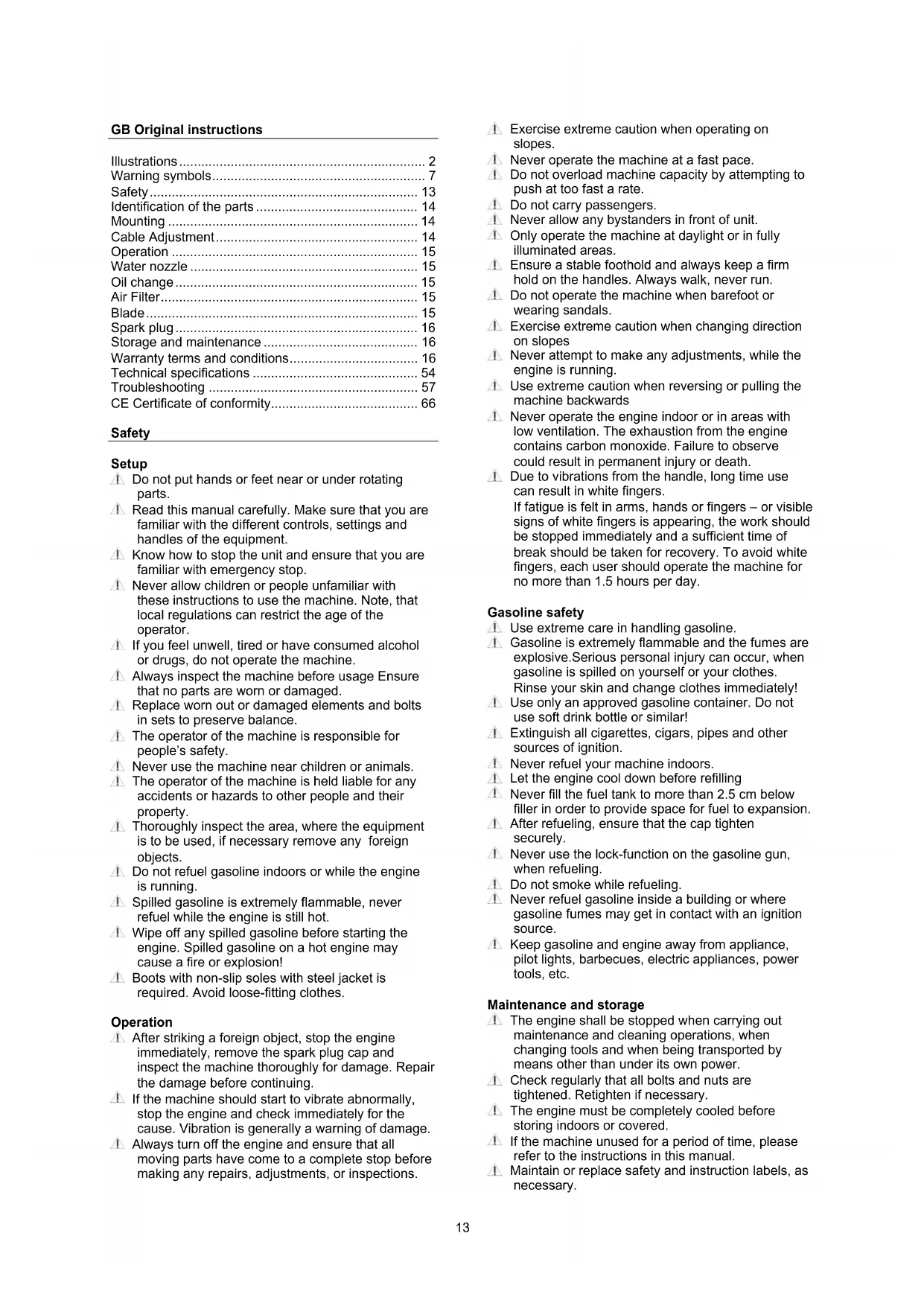 - CE Certificate of conformity Safety Setup Do not put hands or feet near or under rotating parts. Read this manual carefully. Make sure that you are familiar with the different controls, settings and handles of the equipment. Know how to stop the unit and ensure that you are familiar with emergency stop. Never allow children or people unfamiliar with these instructions to use the machine. Note, that local regulations can restrict the age of the operator. If you feel unwell, tired or have consumed alcohol or drugs, do not operate the machine. Always inspect the machine before usage Ensure that no parts are worn or damaged. Replace worn out or damaged elements and bolts in sets to preserve balance. The operator of the machine is responsible for people’s safety. Never use the machine near children or animals. The operator of the machine is held liable for any accidents or hazards to other people and their property. Thoroughly inspect the area, where the equipment is to be used, if necessary remove any foreign objects. Do not refuel gasoline indoors or while the engine is running. Spilled gasoline is extremely flammable, never refuel while the engine is still hot. Wipe off any spilled gasoline before starting the engine. Spilled gasoline on a hot engine may cause a fire or explosion! Boots with non-slip soles with steel jacket is required. Avoid loose-fitting clothes. Operation After striking a foreign object, stop the engine immediately, remove the spark plug cap and inspect the machine thoroughly for damage. Repair the damage before continuing. If the machine should start to vibrate abnormally, stop the engine and check immediately for the cause. Vibration is generally a warning of damage. Always turn off the engine and ensure that all moving parts have come to a complete stop before making any repairs, adjustments, or inspections. Exercise extreme caution when operating on slopes. Never operate the machine at a fast pace. Do not overload machine capacity by attempting to push at too fast a rate. Do not carry passengers. Never allow any bystanders in front of unit. Only operate the machine at daylight or in fully illuminated areas. Ensure a stable foothold and always keep a firm hold on the handles. Always walk, never run. Do not operate the machine when barefoot or wearing sandals. Exercise extreme caution when changing direction on slopes Never attempt to make any adjustments, while the engine is running. Use extreme caution when reversing or pulling the machine backwards Never operate the engine indoor or in areas with low ventilation. The exhaustion from the engine contains carbon monoxide. Failure to observe could result in permanent injury or death. Due to vibrations from the handle, long time use can result in white fingers. If fatigue is felt in arms, hands or fingers – or visible signs of white fingers is appearing, the work should be stopped immediately and a sufficient time of break should be taken for recovery. To avoid white fingers, each user should operate the machine for no more than 1.5 hours per day. Gasoline safety Use extreme care in handling gasoline. Gasoline is extremely flammable and the fumes are explosive.Serious personal injury can occur, when gasoline is spilled on yourself or your clothes. Rinse your skin and change clothes immediately! Use only an approved gasoline container. Do not use soft drink bottle or similar! Extinguish all cigarettes, cigars, pipes and other sources of ignition. Never refuel your machine indoors. Let the engine cool down before refilling Never fill the fuel tank to more than 2.5 cm below filler in order to provide space for fuel to expansion. After refueling, ensure that the cap tighten securely. Never use the lock-function on the gasoline gun, when refueling. Do not smoke while refueling. Never refuel gasoline inside a building or where gasoline fumes may get in contact with an ignition source. Keep gasoline and engine away from appliance, pilot lights, barbecues, electric appliances, power tools, etc. Maintenance and storage The engine shall be stopped when carrying out maintenance and cleaning operations, when changing tools and when being transported by means other than under its own power. Check regularly that all bolts and nuts are tightened. Retighten if necessary. The engine must be completely cooled before storing indoors or covered. If the machine unused for a period of time, please refer to the instructions in this manual. Maintain or replace safety and instruction labels, as necessary.14 Only use orginal spare parts or accessories. If not orginal parts or accessories is used, the liablility is no longer applied. Miscellaneous The motor is not pre-filled with oil. Always before start check the engine oil level. Factory-fitted control devices, such as the handle- mounted clutch cable, must not be removed or exposed. Only drain the fuel tank outdoors. Gasoline is extremely flammable and the fumes are explosive. Ensure that the machine is properly secured when transported on a flatbed etc. p. 66