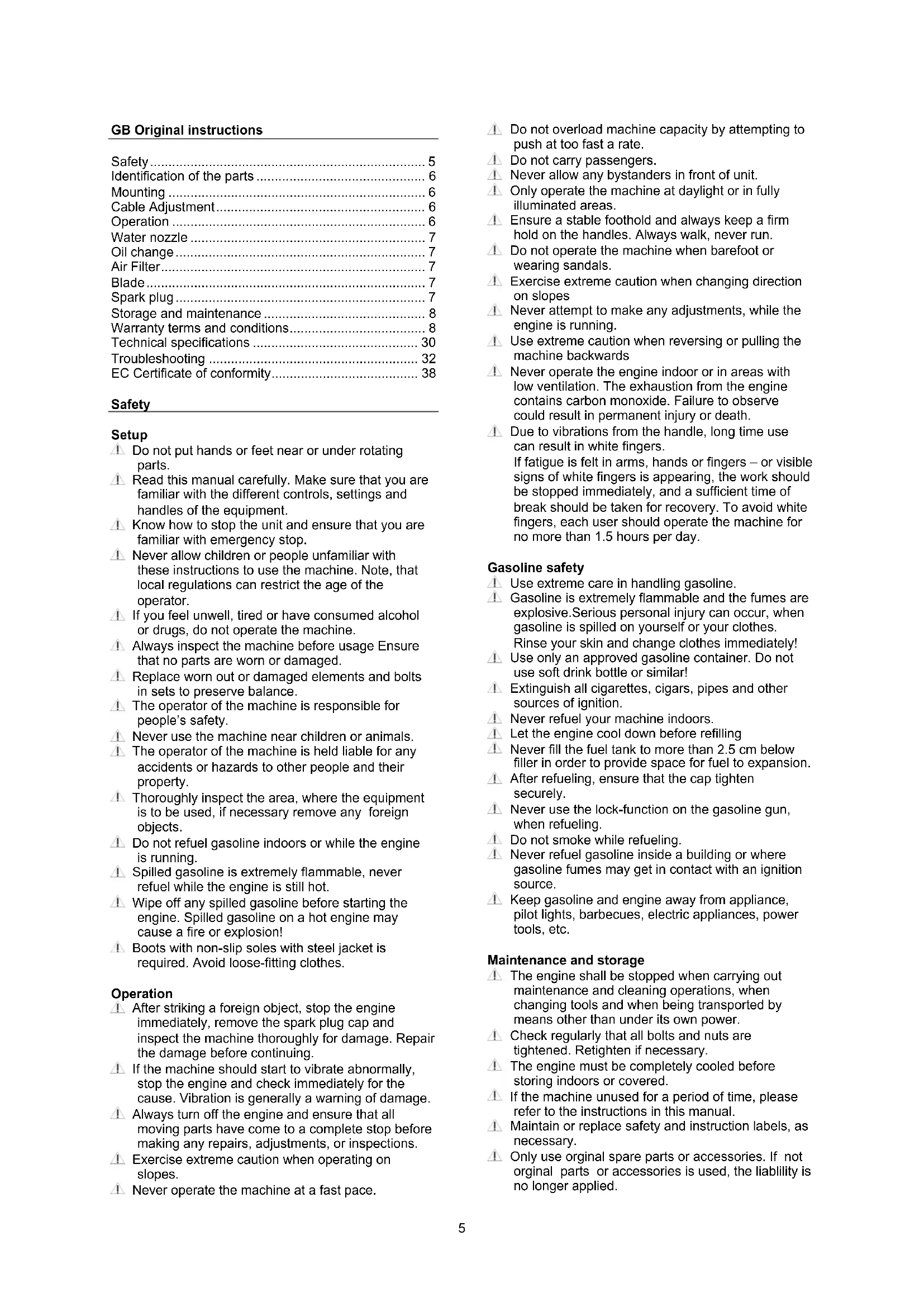 - EC Certificate of conformity Safety Setup Do not put hands or feet near or under rotating parts. Read this manual carefully. Make sure that you are familiar with the different controls, settings and handles of the equipment. Know how to stop the unit and ensure that you are familiar with emergency stop. Never allow children or people unfamiliar with these instructions to use the machine. Note, that local regulations can restrict the age of the operator. If you feel unwell, tired or have consumed alcohol or drugs, do not operate the machine. Always inspect the machine before usage Ensure that no parts are worn or damaged. Replace worn out or damaged elements and bolts in sets to preserve balance. The operator of the machine is responsible for people’s safety. Never use the machine near children or animals. The operator of the machine is held liable for any accidents or hazards to other people and their property. Thoroughly inspect the area, where the equipment is to be used, if necessary remove any foreign objects. Do not refuel gasoline indoors or while the engine is running. Spilled gasoline is extremely flammable, never refuel while the engine is still hot. Wipe off any spilled gasoline before starting the engine. Spilled gasoline on a hot engine may cause a fire or explosion! Boots with non-slip soles with steel jacket is required. Avoid loose-fitting clothes. Operation After striking a foreign object, stop the engine immediately, remove the spark plug cap and inspect the machine thoroughly for damage. Repair the damage before continuing. If the machine should start to vibrate abnormally, stop the engine and check immediately for the cause. Vibration is generally a warning of damage. Always turn off the engine and ensure that all moving parts have come to a complete stop before making any repairs, adjustments, or inspections. Exercise extreme caution when operating on slopes. Never operate the machine at a fast pace. Do not overload machine capacity by attempting to push at too fast a rate. Do not carry passengers. Never allow any bystanders in front of unit. Only operate the machine at daylight or in fully illuminated areas. Ensure a stable foothold and always keep a firm hold on the handles. Always walk, never run. Do not operate the machine when barefoot or wearing sandals. Exercise extreme caution when changing direction on slopes Never attempt to make any adjustments, while the engine is running. Use extreme caution when reversing or pulling the machine backwards Never operate the engine indoor or in areas with low ventilation. The exhaustion from the engine contains carbon monoxide. Failure to observe could result in permanent injury or death. Due to vibrations from the handle, long time use can result in white fingers. If fatigue is felt in arms, hands or fingers – or visible signs of white fingers is appearing, the work should be stopped immediately, and a sufficient time of break should be taken for recovery. To avoid white fingers, each user should operate the machine for no more than 1.5 hours per day. Gasoline safety Use extreme care in handling gasoline. Gasoline is extremely flammable and the fumes are explosive.Serious personal injury can occur, when gasoline is spilled on yourself or your clothes. Rinse your skin and change clothes immediately! Use only an approved gasoline container. Do not use soft drink bottle or similar! Extinguish all cigarettes, cigars, pipes and other sources of ignition. Never refuel your machine indoors. Let the engine cool down before refilling Never fill the fuel tank to more than 2.5 cm below filler in order to provide space for fuel to expansion. After refueling, ensure that the cap tighten securely. Never use the lock-function on the gasoline gun, when refueling. Do not smoke while refueling. Never refuel gasoline inside a building or where gasoline fumes may get in contact with an ignition source. Keep gasoline and engine away from appliance, pilot lights, barbecues, electric appliances, power tools, etc. Maintenance and storage The engine shall be stopped when carrying out maintenance and cleaning operations, when changing tools and when being transported by means other than under its own power. Check regularly that all bolts and nuts are tightened. Retighten if necessary. The engine must be completely cooled before storing indoors or covered. If the machine unused for a period of time, please refer to the instructions in this manual. Maintain or replace safety and instruction labels, as necessary. Only use orginal spare parts or accessories. If not orginal parts or accessories is used, the liablility is no longer applied.6 Miscellaneous The motor is not pre-filled with oil. Always before start check the engine oil level. Factory-fitted control devices, such as the handle- mounted clutch cable, must not be removed or exposed. Only drain the fuel tank outdoors. Gasoline is extremely flammable and the fumes are explosive. Ensure that the machine is properly secured when transported on a flatbed etc. The lawnmower is manufactured according to the latest safety requirements. These include a blade brake that stops the motor and blade in 3 seconds when the blade brake. Every precaution is only effective when it is followed exactly. Use the following description when you mount your lawnmower. Identification of the parts See Illustration ID Notice: the illustrations may vary from your present model B. Handlebar for engine brake C. Recoil starter D. Wing nut H. Gasoline filling cap p. 38