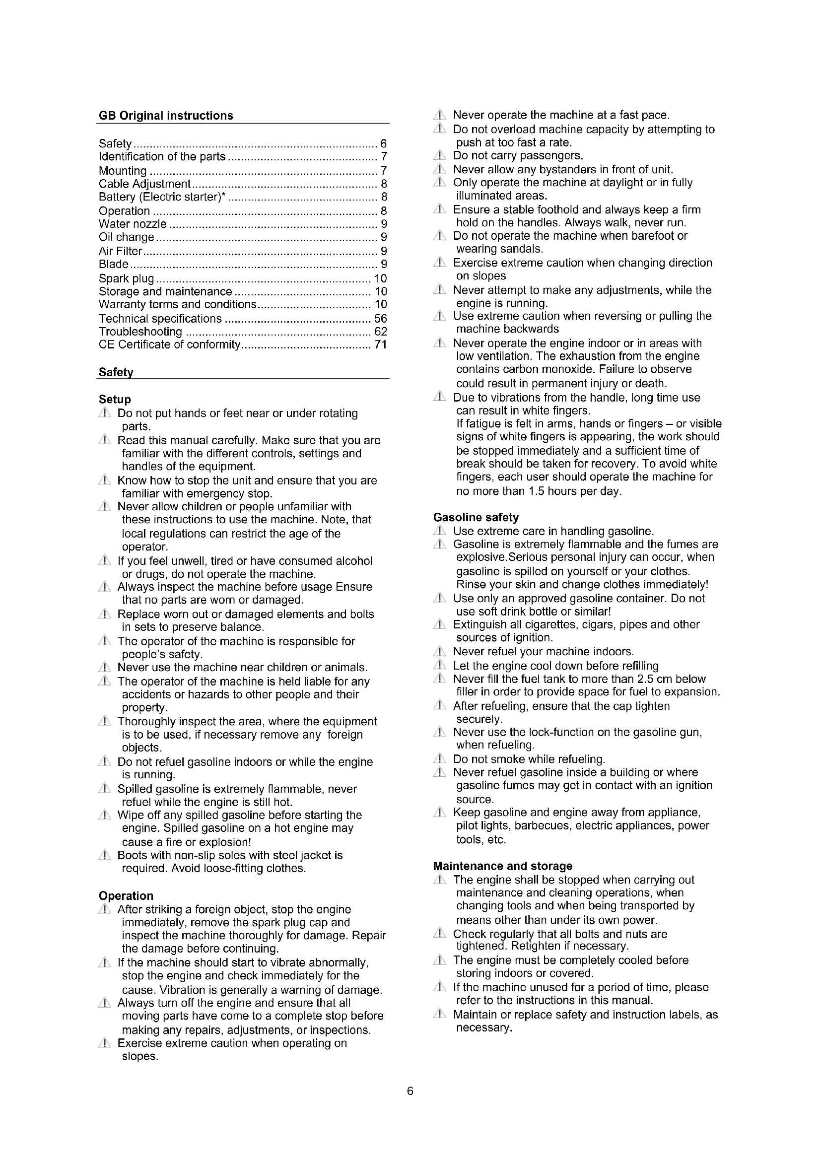 - CE Certificate of conformity Safety Setup Do not put hands or feet near or under rotating parts. Read this manual carefully. Make sure that you are familiar with the different controls, settings and handles of the equipment. Know how to stop the unit and ensure that you are familiar with emergency stop. Never allow children or people unfamiliar with these instructions to use the machine. Note, that local regulations can restrict the age of the operator. If you feel unwell, tired or have consumed alcohol or drugs, do not operate the machine. Always inspect the machine before usage Ensure that no parts are worn or damaged. Replace worn out or damaged elements and bolts in sets to preserve balance. The operator of the machine is responsible for people’s safety. Never use the machine near children or animals. The operator of the machine is held liable for any accidents or hazards to other people and their property. Thoroughly inspect the area, where the equipment is to be used, if necessary remove any foreign objects. Do not refuel gasoline indoors or while the engine is running. Spilled gasoline is extremely flammable, never refuel while the engine is still hot. Wipe off any spilled gasoline before starting the engine. Spilled gasoline on a hot engine may cause a fire or explosion! Boots with non-slip soles with steel jacket is required. Avoid loose-fitting clothes. Operation After striking a foreign object, stop the engine immediately, remove the spark plug cap and inspect the machine thoroughly for damage. Repair the damage before continuing. If the machine should start to vibrate abnormally, stop the engine and check immediately for the cause. Vibration is generally a warning of damage. Always turn off the engine and ensure that all moving parts have come to a complete stop before making any repairs, adjustments, or inspections. Exercise extreme caution when operating on slopes. Never operate the machine at a fast pace. Do not overload machine capacity by attempting to push at too fast a rate. Do not carry passengers. Never allow any bystanders in front of unit. Only operate the machine at daylight or in fully illuminated areas. Ensure a stable foothold and always keep a firm hold on the handles. Always walk, never run. Do not operate the machine when barefoot or wearing sandals. Exercise extreme caution when changing direction on slopes Never attempt to make any adjustments, while the engine is running. Use extreme caution when reversing or pulling the machine backwards Never operate the engine indoor or in areas with low ventilation. The exhaustion from the engine contains carbon monoxide. Failure to observe could result in permanent injury or death. Due to vibrations from the handle, long time use can result in white fingers. If fatigue is felt in arms, hands or fingers – or visible signs of white fingers is appearing, the work should be stopped immediately and a sufficient time of break should be taken for recovery. To avoid white fingers, each user should operate the machine for no more than 1.5 hours per day. Gasoline safety Use extreme care in handling gasoline. Gasoline is extremely flammable and the fumes are explosive.Serious personal injury can occur, when gasoline is spilled on yourself or your clothes. Rinse your skin and change clothes immediately! Use only an approved gasoline container. Do not use soft drink bottle or similar! Extinguish all cigarettes, cigars, pipes and other sources of ignition. Never refuel your machine indoors. Let the engine cool down before refilling Never fill the fuel tank to more than 2.5 cm below filler in order to provide space for fuel to expansion. After refueling, ensure that the cap tighten securely. Never use the lock-function on the gasoline gun, when refueling. Do not smoke while refueling. Never refuel gasoline inside a building or where gasoline fumes may get in contact with an ignition source. Keep gasoline and engine away from appliance, pilot lights, barbecues, electric appliances, power tools, etc. Maintenance and storage The engine shall be stopped when carrying out maintenance and cleaning operations, when changing tools and when being transported by means other than under its own power. Check regularly that all bolts and nuts are tightened. Retighten if necessary. The engine must be completely cooled before storing indoors or covered. If the machine unused for a period of time, please refer to the instructions in this manual. Maintain or replace safety and instruction labels, as necessary.7 Only use orginal spare parts or accessories. If not orginal parts or accessories is used, the liablility is no longer applied. Miscellaneous The motor is not pre-filled with oil. Always before start check the engine oil level. Factory-fitted control devices, such as the handle- mounted clutch cable, must not be removed or exposed. Only drain the fuel tank outdoors. Gasoline is extremely flammable and the fumes are explosive. Ensure that the machine is properly secured when transported on a flatbed etc. p. 71