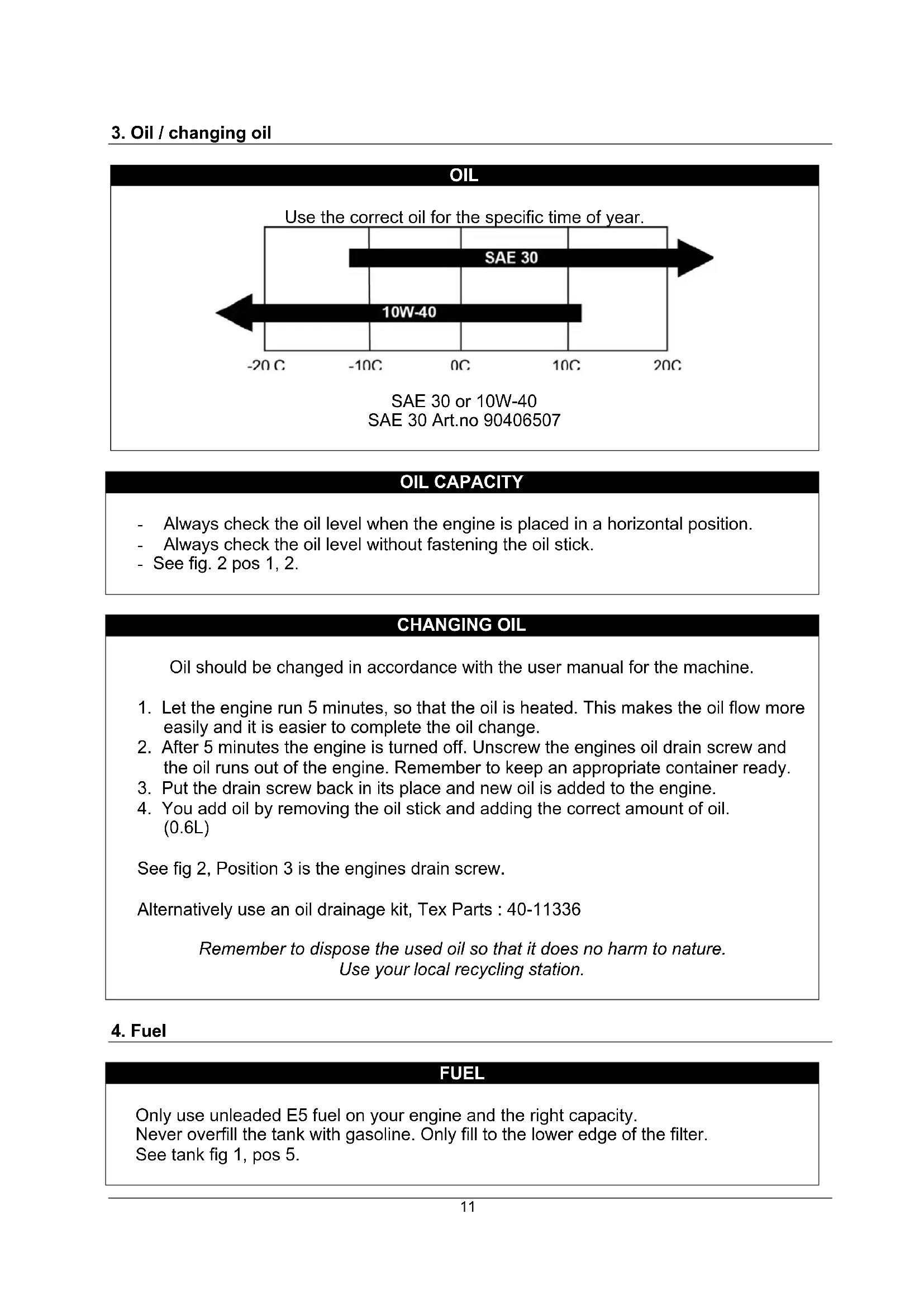 (0.6L) See fig 2, Position 3 is the engines drain screw. Alternatively use an oil drainage kit, Tex Parts : 40-11336 Remember to dispose the used oil so that it does no harm to nature. Use your local recycling station.