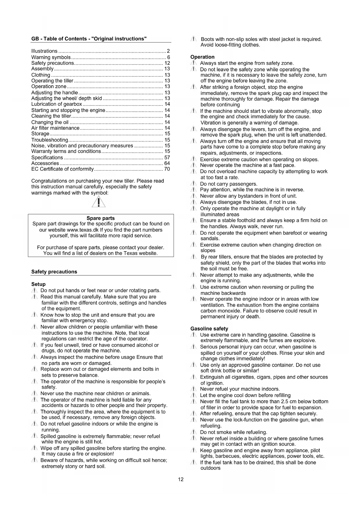 Safety precautions Setup Do not put hands or feet near or under rotating parts. Read this manual carefully. Make sure that you are familiar with the different controls, settings and handles of the equipment. Know how to stop the unit and ensure that you are familiar with emergency stop. Never allow children or people unfamiliar with these instructions to use the machine. Note, that local regulations can restrict the age of the operator. If you feel unwell, tired or have consumed alcohol or drugs, do not operate the machine. Always inspect the machine before usage Ensure that no parts are worn or damaged. Replace worn out or damaged elements and bolts in sets to preserve balance. The operator of the machine is responsible for people’s safety. Never use the machine near children or animals. The operator of the machine is held liable for any accidents or hazards to other people and their property. Thoroughly inspect the area, where the equipment is to be used, if necessary, remove any foreign objects. Do not refuel gasoline indoors or while the engine is running. Spilled gasoline is extremely flammable; never refuel while the engine is still hot. Wipe off any spilled gasoline before starting the engine. It may cause a fire or explosion! Beware of hazards, while working on difficult soil hence; extremely stony or hard soil. Boots with non-slip soles with steel jacket is required. Avoid loose-fitting clothes. Operation Always start the engine from safety zone. Do not leave the safety zone while operating the machine, if it is necessary to leave the safety zone, turn off the engine before leaving the zone. After striking a foreign object, stop the engine immediately, remove the spark plug cap and inspect the machine thoroughly for damage. Repair the damage before continuing If the machine should start to vibrate abnormally, stop the engine and check immediately for the cause. Vibration is generally a warning of damage. Always disengage the levers, turn off the engine, and remove the spark plug, when the unit is left unattended. Always turn off the engine and ensure that all moving parts have come to a complete stop before making any repairs, adjustments, or inspections. Exercise extreme caution when operating on slopes. Never operate the machine at a fast pace. Do not overload machine capacity by attempting to work at too fast a rate. Do not carry passengers. Pay attention, while the machine is in reverse. Never allow any bystanders in front of unit. Always disengage the blades, if not in use. Only operate the machine at daylight or in fully illuminated areas Ensure a stable foothold and always keep a firm hold on the handles. Always walk, never run. Do not operate the equipment when barefoot or wearing sandals. Exercise extreme caution when changing direction on slopes By rear tillers, ensure that the blades are protected by safety shield, only the part of the blades that works into the soil must be free. Never attempt to make any adjustments, while the engine is running. Use extreme caution when reversing or pulling the machine backwards Never operate the engine indoor or in areas with low ventilation. The exhaustion from the engine contains carbon monoxide. Failure to observe could result in permanent injury or death. Gasoline safety Use extreme care in handling gasoline. Gasoline is extremely flammable, and the fumes are explosive. Serious personal injury can occur, when gasoline is spilled on yourself or your clothes. Rinse your skin and change clothes immediately! Use only an approved gasoline container. Do not use soft drink bottle or similar! Extinguish all cigarettes, cigars, pipes and other sources of ignition. Never refuel your machine indoors. Let the engine cool down before refilling Never fill the fuel tank to more than 2.5 cm below bottom of filler in order to provide space for fuel to expansion. After refueling, ensure that the cap tighten securely. Never use the lock-function on the gasoline gun, when refueling. Do not smoke while refueling. Never refuel inside a building or where gasoline fumes may get in contact with an ignition source. Keep gasoline and engine away from appliance, pilot lights, barbecues, electric appliances, power tools, etc. If the fuel tank has to be drained, this shall be done outdoors13