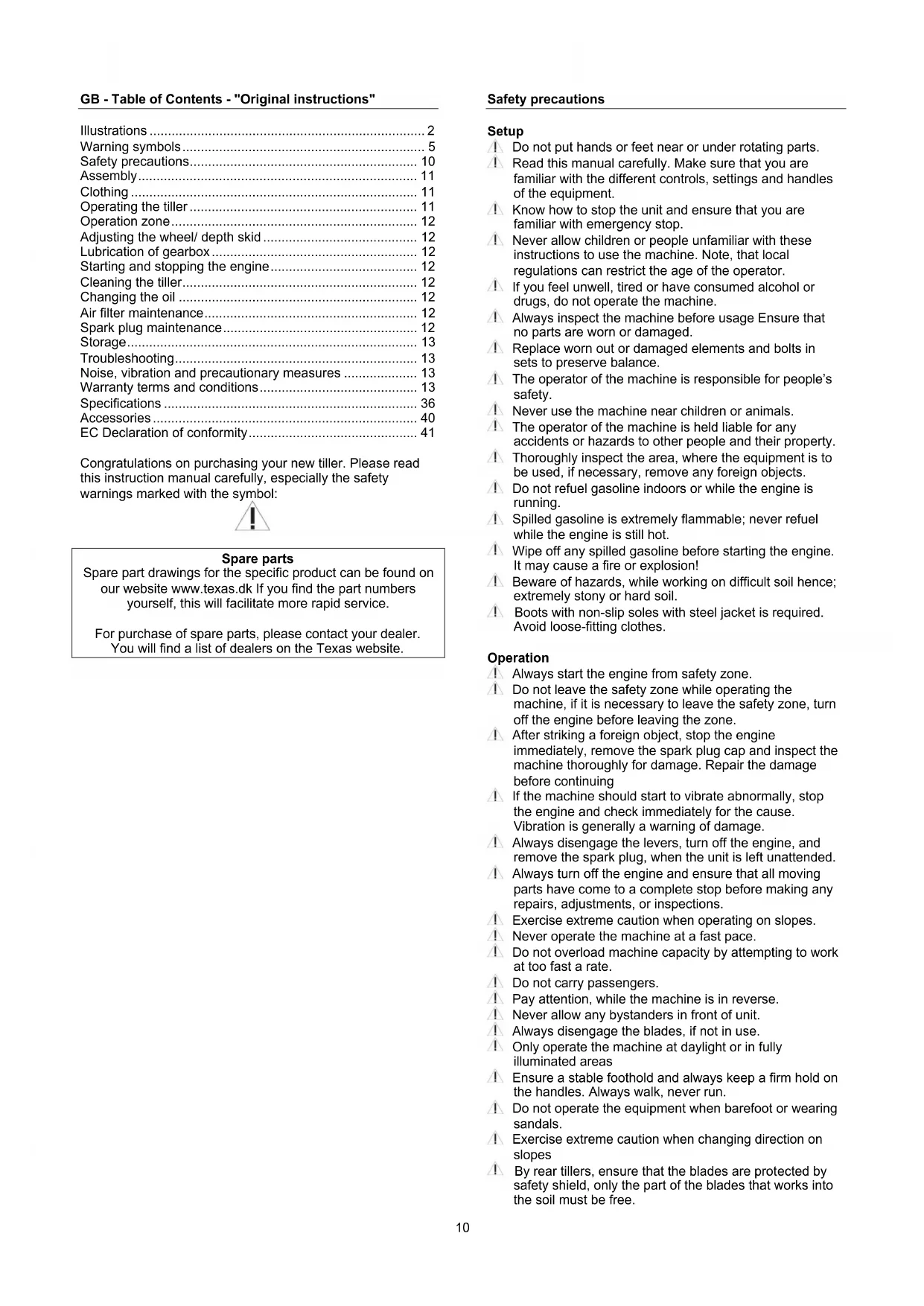 Safety precautions Setup Do not put hands or feet near or under rotating parts. Read this manual carefully. Make sure that you are familiar with the different controls, settings and handles of the equipment. Know how to stop the unit and ensure that you are familiar with emergency stop. Never allow children or people unfamiliar with these instructions to use the machine. Note, that local regulations can restrict the age of the operator. If you feel unwell, tired or have consumed alcohol or drugs, do not operate the machine. Always inspect the machine before usage Ensure that no parts are worn or damaged. Replace worn out or damaged elements and bolts in sets to preserve balance. The operator of the machine is responsible for people’s safety. Never use the machine near children or animals. The operator of the machine is held liable for any accidents or hazards to other people and their property. Thoroughly inspect the area, where the equipment is to be used, if necessary, remove any foreign objects. Do not refuel gasoline indoors or while the engine is running. Spilled gasoline is extremely flammable; never refuel while the engine is still hot. Wipe off any spilled gasoline before starting the engine. It may cause a fire or explosion! Beware of hazards, while working on difficult soil hence; extremely stony or hard soil. Boots with non-slip soles with steel jacket is required. Avoid loose-fitting clothes. Operation Always start the engine from safety zone. Do not leave the safety zone while operating the machine, if it is necessary to leave the safety zone, turn off the engine before leaving the zone. After striking a foreign object, stop the engine immediately, remove the spark plug cap and inspect the machine thoroughly for damage. Repair the damage before continuing If the machine should start to vibrate abnormally, stop the engine and check immediately for the cause. Vibration is generally a warning of damage. Always disengage the levers, turn off the engine, and remove the spark plug, when the unit is left unattended. Always turn off the engine and ensure that all moving parts have come to a complete stop before making any repairs, adjustments, or inspections. Exercise extreme caution when operating on slopes. Never operate the machine at a fast pace. Do not overload machine capacity by attempting to work at too fast a rate. Do not carry passengers. Pay attention, while the machine is in reverse. Never allow any bystanders in front of unit. Always disengage the blades, if not in use. Only operate the machine at daylight or in fully illuminated areas Ensure a stable foothold and always keep a firm hold on the handles. Always walk, never run. Do not operate the equipment when barefoot or wearing sandals. Exercise extreme caution when changing direction on slopes By rear tillers, ensure that the blades are protected by safety shield, only the part of the blades that works into the soil must be free.11