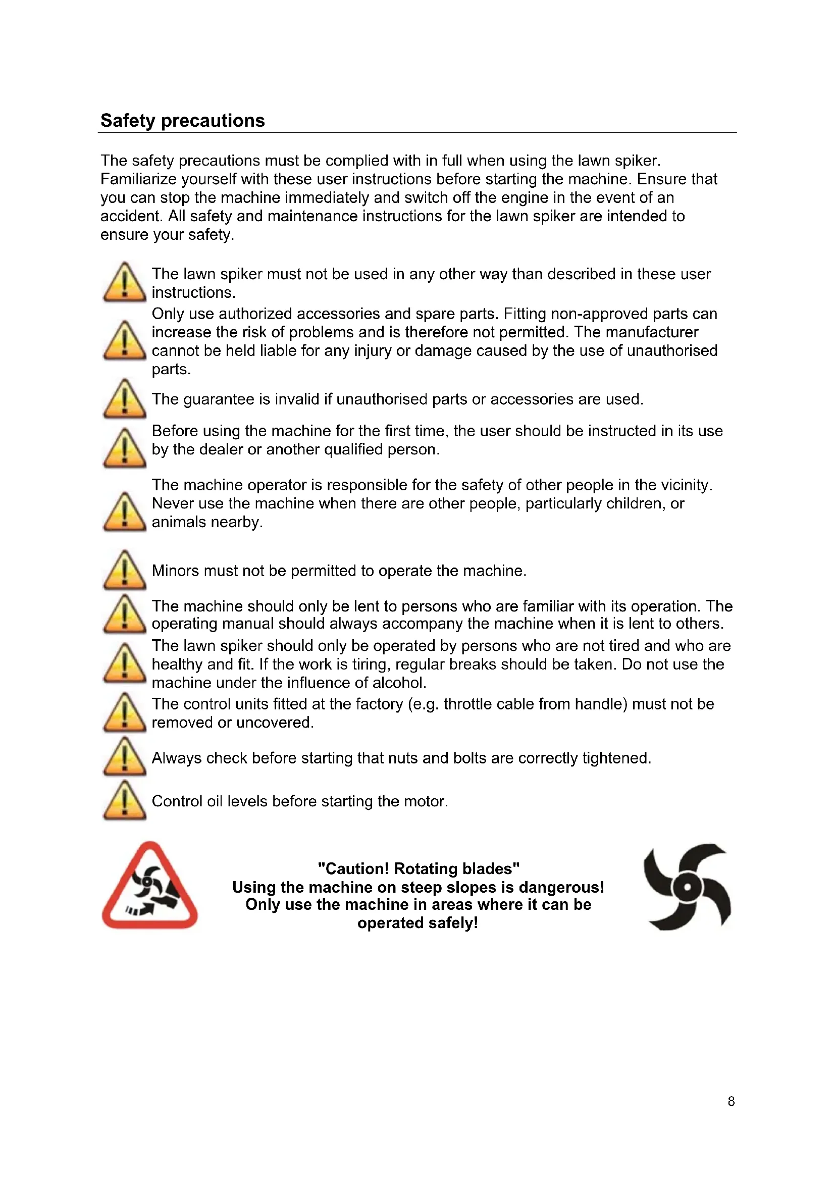 Spare parts Spare part drawings for the specific product can be found on our website www.texas.dk If you find the part numbers yourself, this will facilitate more rapid service. For purchase of spare parts, please contact your dealer. You will find a list of dealers on the Texas website.8 Safety precautions The safety precautions must be complied with in full when using the lawn spiker. Familiarize yourself with these user instructions before starting the machine. Ensure that you can stop the machine immediately and switch off the engine in the event of an accident. All safety and maintenance instructions for the lawn spiker are intended to ensure your safety. The lawn spiker must not be used in any other way than described in these user instructions. Only use authorized accessories and spare parts. Fitting non-approved parts can increase the risk of problems and is therefore not permitted. The manufacturer cannot be held liable for any injury or damage caused by the use of unauthorised parts. The guarantee is invalid if unauthorised parts or accessories are used. Before using the machine for the first time, the user should be instructed in its use by the dealer or another qualified person. The machine operator is responsible for the safety of other people in the vicinity. Never use the machine when there are other people, particularly children, or animals nearby. Minors must not be permitted to operate the machine. The machine should only be lent to persons who are familiar with its operation. The operating manual should always accompany the machine when it is lent to others. The lawn spiker should only be operated by persons who are not tired and who are healthy and fit. If the work is tiring, regular breaks should be taken. Do not use the machine under the influence of alcohol. The control units fitted at the factory (e.g. throttle cable from handle) must not be removed or uncovered. Always check before starting that nuts and bolts are correctly tightened. Control oil levels before starting the motor.