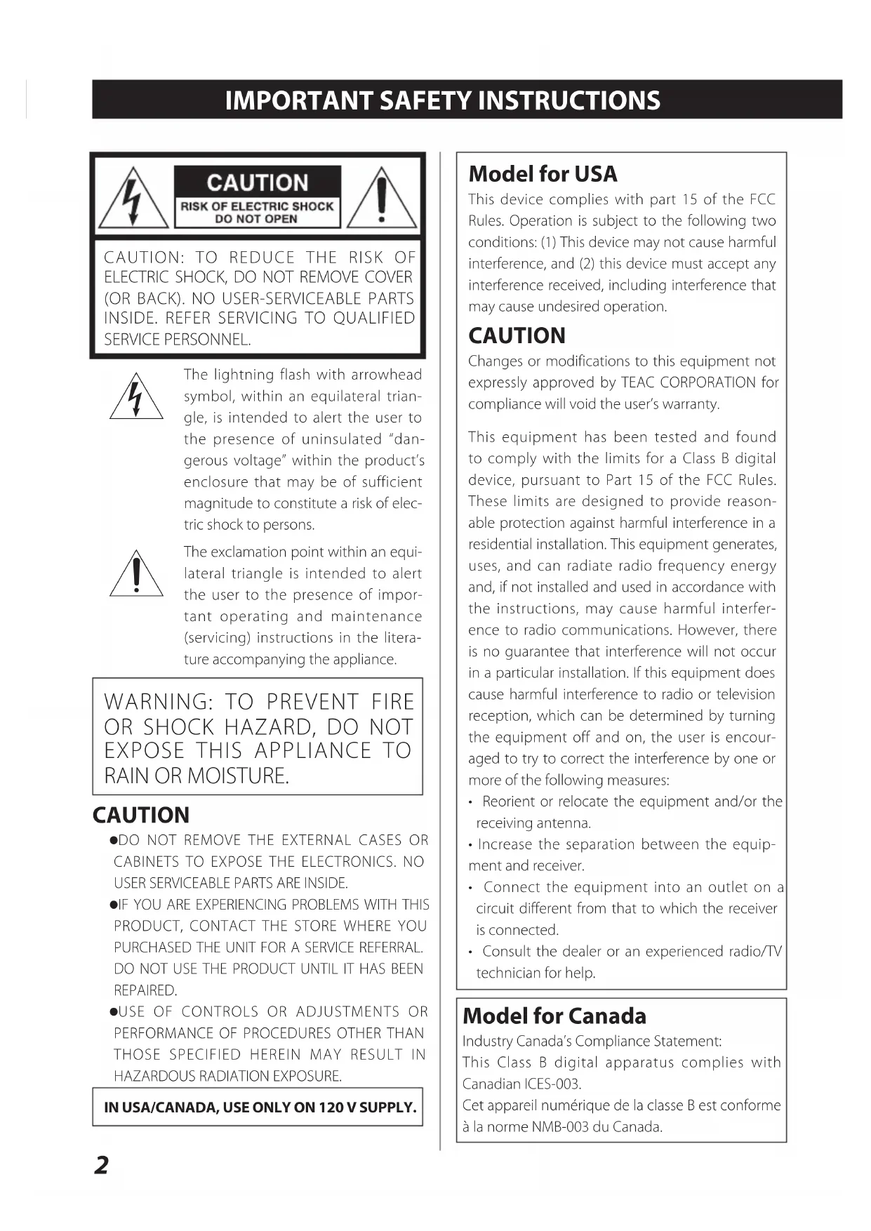 HAZARDOUS RADIATION EXPOSURE. IN USA/CANADA, USE ONLY ON 120 V SUPPLY. Model for USA This device complies with part 15 of the FCC Rules. Operation is subject to the following two conditions: (1) This device may not cause harmful interference, and (2) this device must accept any interference received, including interference that may cause undesired operation. CAUTION Changes or modifications to this equipment not expressly approved by TEAC CORPORATION for compliance will void the user’s warranty. This equipment has been tested and found to comply with the limits for a Class B digital device, pursuant to Part 15 of the FCC Rules. These limits are designed to provide reason- able protection against harmful interference in a residential installation. This equipment generates, uses, and can radiate radio frequency energy and, if not installed and used in accordance with the instructions, may cause harmful interfer- ence to radio communications. However, there is no guarantee that interference will not occur in a particular installation. If this equipment does cause harmful interference to radio or television reception, which can be determined by turning the equipment off and on, the user is encour- aged to try to correct the interference by one or more of the following measures: