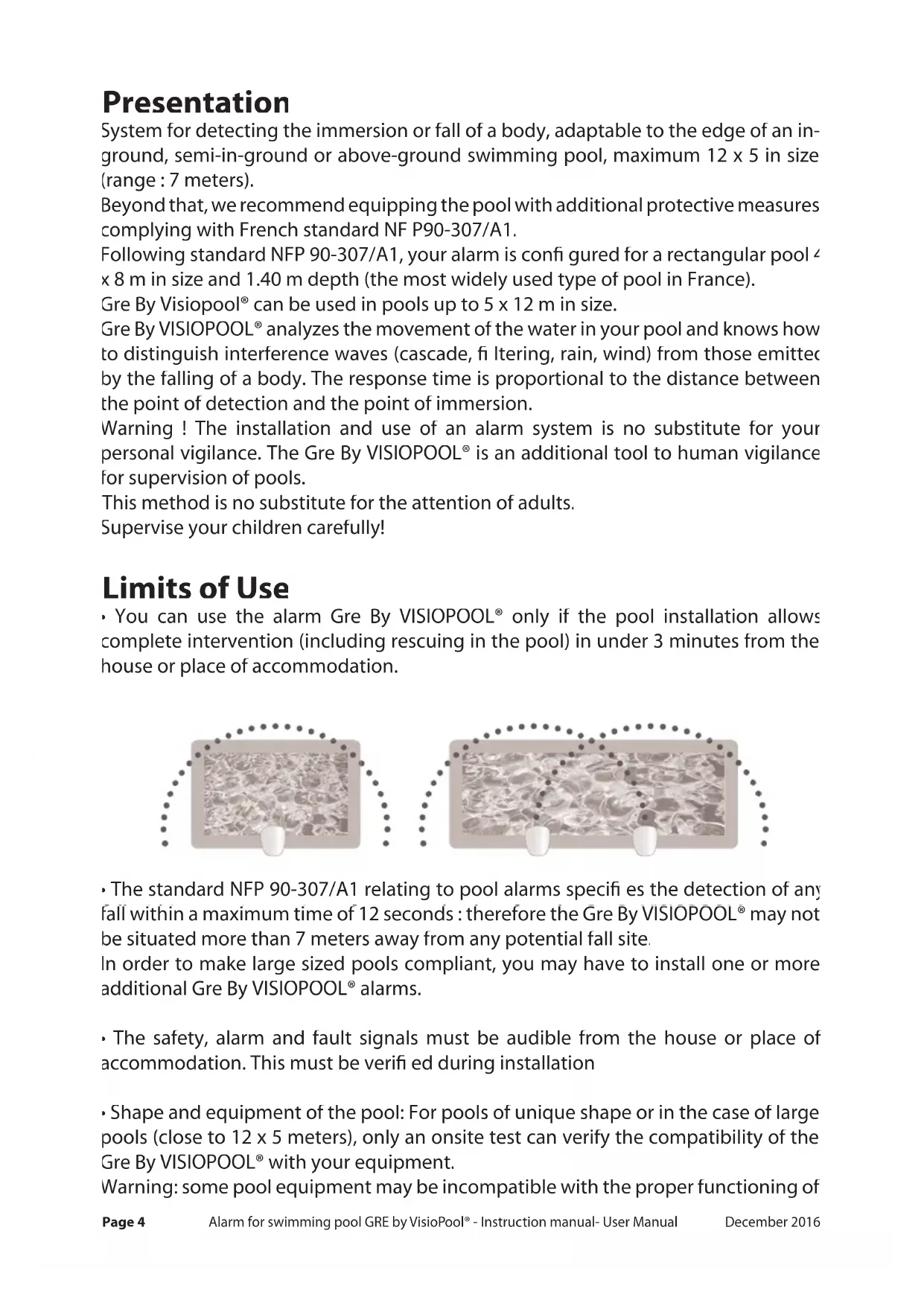 - Safety Advice Page 4 Alarm for swimming pool GRE by VisioPool® - Instruction manual- User Manual December 2016 Presentation System for detecting the immersion or fall of a body, adaptable to the edge of an in- ground, semi-in-ground or above-ground swimming pool, maximum 12 x 5 in size (range : 7 meters). Beyond that, we recommend equipping the pool with additional protective measures complying with French standard NF P90-307/A1. Following standard NFP 90-307/A1, your alarm is con gured for a rectangular pool 4 x 8 m in size and 1.40 m depth (the most widely used type of pool in France). Gre By Visiopool® can be used in pools up to 5 x 12 m in size. Gre By VISIOPOOL® analyzes the movement of the water in your pool and knows how to distinguish interference waves (cascade, ltering, rain, wind) from those emitted by the falling of a body. The response time is proportional to the distance between the point of detection and the point of immersion. Warning ! The installation and use of an alarm system is no substitute for your personal vigilance. The Gre By VISIOPOOL® is an additional tool to human vigilance for supervision of pools. This method is no substitute for the attention of adults. Supervise your children carefully! Limits of Use p. 14