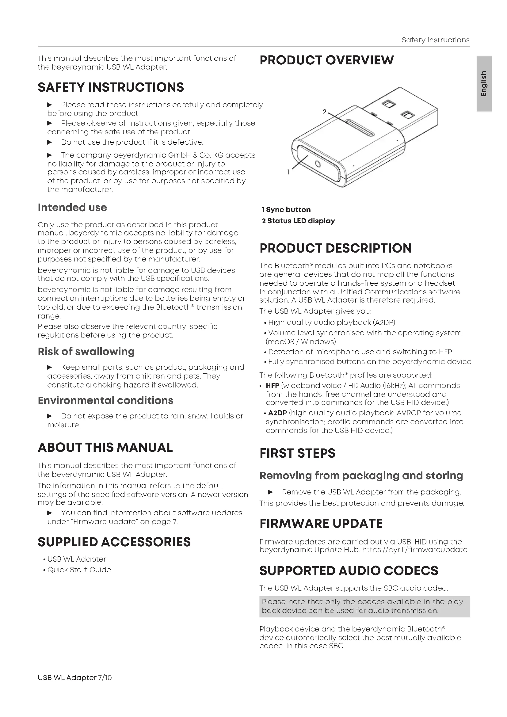 - A2DP (high quality audio playback; AVRCP for volume synchronisation; profile commands are conveed into commands for the USB HID device.) FIRST STEPS Removing from packaging and oring ► Remove the USB WL Adapter from the packaging. This provides the be protection and prevents damage. FIRMWARE UPDATE Firmware updates are carried out via USB-HID using the beyerdynamic Update Hub: https://byr.li/firmwareupdate