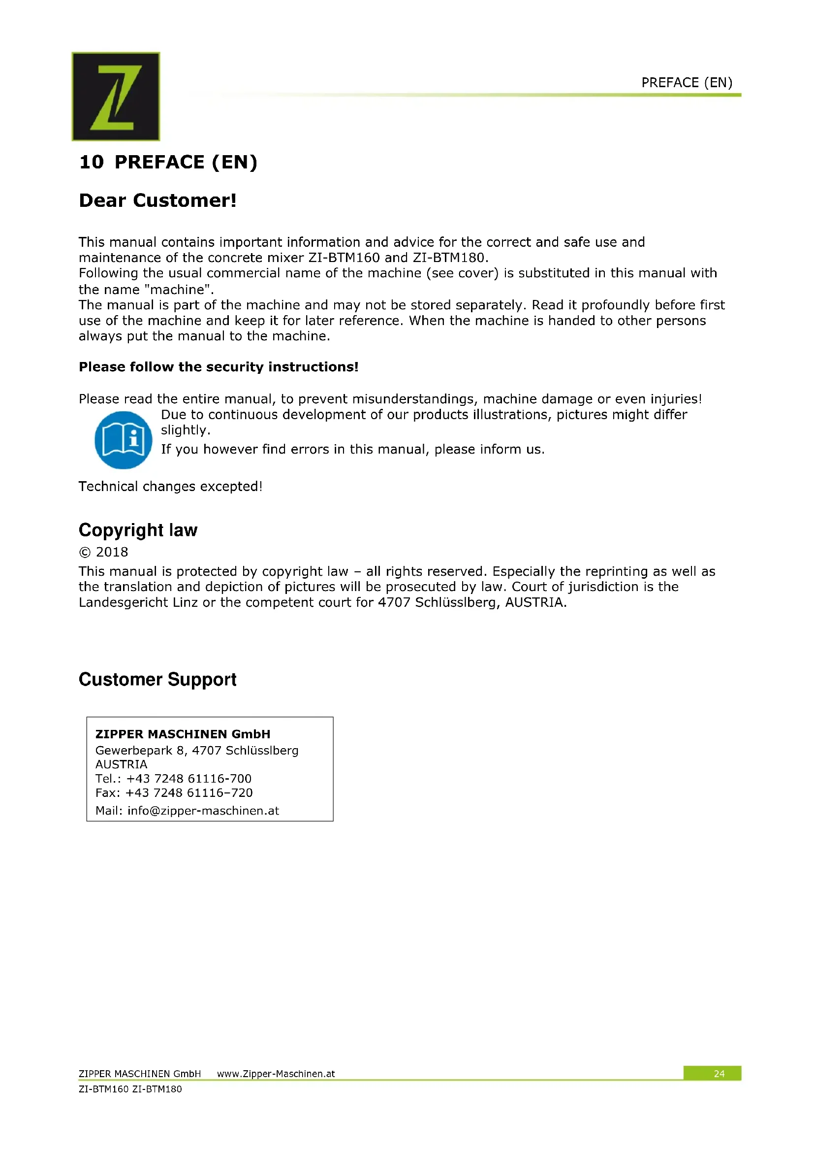 HINWEIS Sollten sie sich bei notwendigen Reparaturen nicht in der Lage fühlen diese ordnungsgemäß zu verrichten, oder besitzen sie die vorgeschriebene Ausbildung dafür nicht, ziehen sie immer eine Fachwerkstätte zum Beheben des Problems hinzu.PREFACE (EN) ZIPPER MASCHINEN GmbH www.Zipper-Maschinen.at 24 ZI-BTM160 ZI-BTM180 10 PREFACE (EN) Dear Customer! This manual contains important information and advice for the correct and safe use and maintenance of the concrete mixer ZI-BTM160 and ZI-BTM180. Following the usual commercial name of the machine (see cover) is substituted in this manual with the name "machine". The manual is part of the machine and may not be stored separately. Read it profoundly before first use of the machine and keep it for later reference. When the machine is handed to other persons always put the manual to the machine. Please follow the security instructions! Please read the entire manual, to prevent misunderstandings, machine damage or even injuries! Due to continuous development of our products illustrations, pictures might differ slightly. If you however find errors in this manual, please inform us. Technical changes excepted! Copyright law © 2018 This manual is protected by copyright law – all rights reserved. Especially the reprinting as well as the translation and depiction of pictures will be prosecuted by law. Court of jurisdiction is the Landesgericht Linz or the competent court for 4707 Schlüsslberg, AUSTRIA.