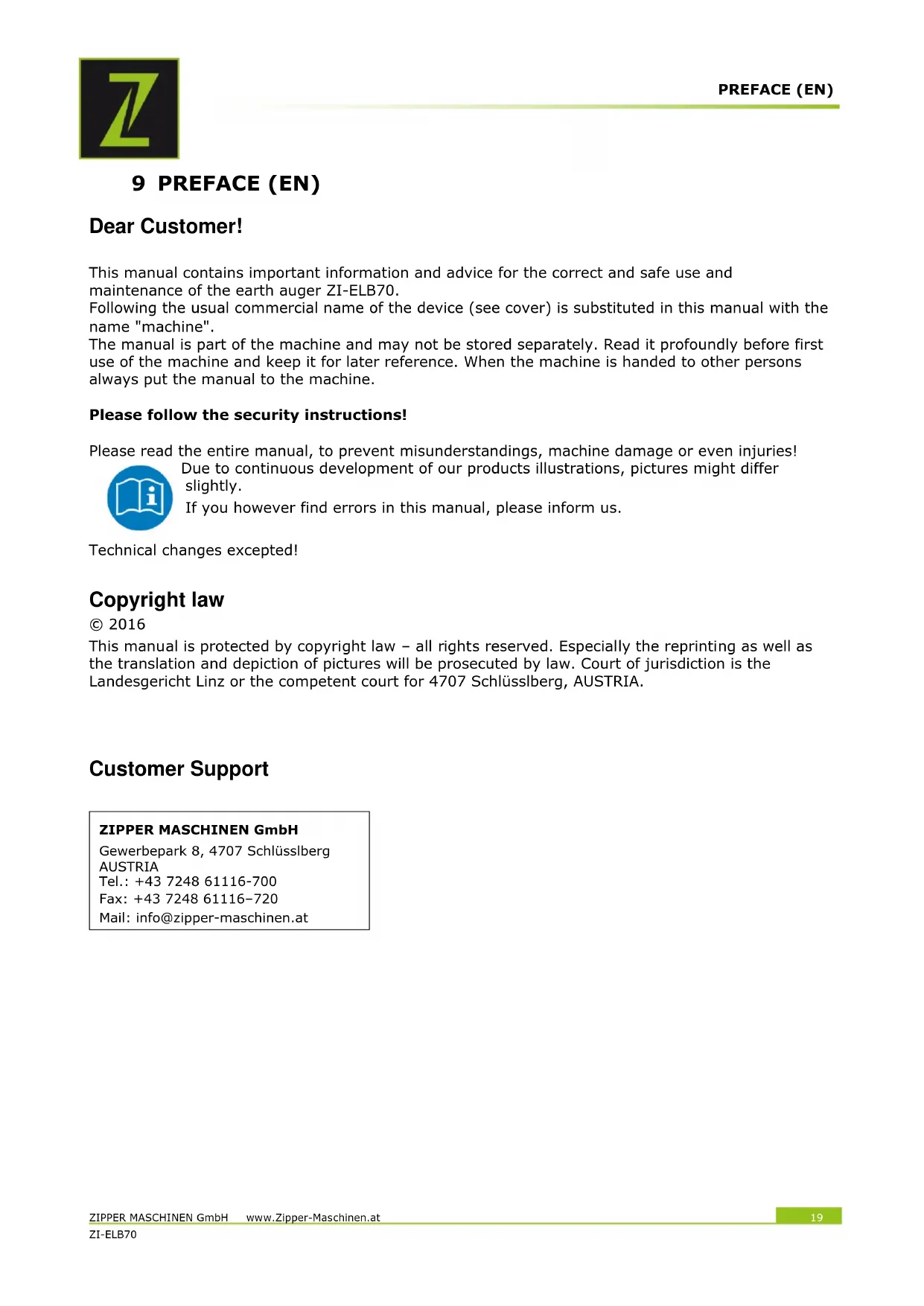 HINWEIS Sollten Sie sich bei notwendigen Reparaturen nicht in der Lage fühlen diese ordnungsgemäß zu verrichten, oder besitzen Sie die vorgeschriebene Ausbildung dafür nicht, ziehen Sie immer eine Fachwerkstätte zum Beheben des Problems hinzu.PREFACE (EN) ZIPPER MASCHINEN GmbH www.Zipper-Maschinen.at 19 ZI-ELB70 19 9 PREFACE (EN) Dear Customer! This manual contains important information and advice for the correct and safe use and maintenance of the earth auger ZI-ELB70. Following the usual commercial name of the device (see cover) is substituted in this manual with the name "machine". The manual is part of the machine and may not be stored separately. Read it profoundly before first use of the machine and keep it for later reference. When the machine is handed to other persons always put the manual to the machine. Please follow the security instructions! Please read the entire manual, to prevent misunderstandings, machine damage or even injuries! Due to continuous development of our products illustrations, pictures might differ slightly. If you however find errors in this manual, please inform us. Technical changes excepted! Copyright law © 2016 This manual is protected by copyright law – all rights reserved. Especially the reprinting as well as the translation and depiction of pictures will be prosecuted by law. Court of jurisdiction is the Landesgericht Linz or the competent court for 4707 Schlüsslberg, AUSTRIA.