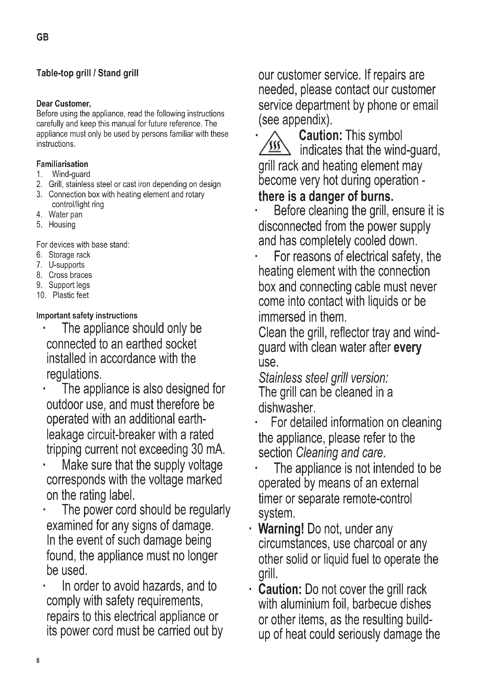 - During operation, the grill must be placed on a level, heat-resistant surface, impervious to splashes and stains. When grilling food with a high fat or moisture content, splashes are not always avoidable.