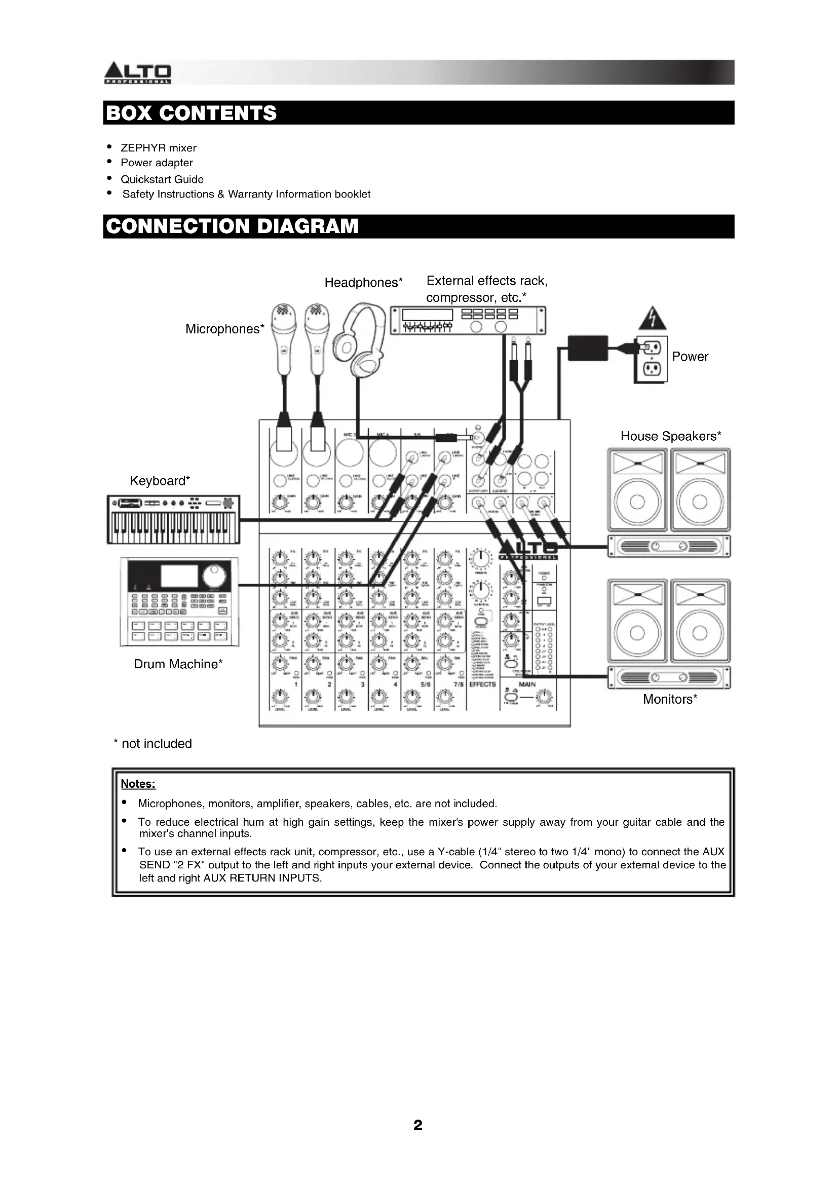 Keyboard* Drum Machine* Microphones* Headphones* External effects rack, compressor, etc.* Notes: y Microphones, monitors, amplifier, speakers, cables, etc. are not included. y To reduce electrical hum at high gain settings, keep the mixer's power supply away from your guitar cable and the mixer's channel inputs. y To use an external effects rack unit, compressor, etc., use a Y-cable (1/4" stereo to two 1/4" mono) to connect the AUX SEND "2 FX" output to the left and right inputs your external device. Connect the outputs of your external device to the left and right AUX RETURN INPUTS.