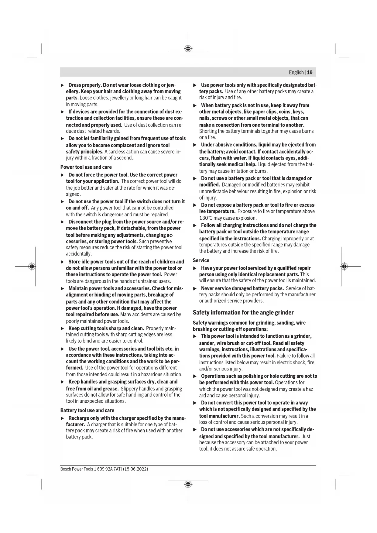 äußeren Abmessung größer als 25cm sind, im Einzel- handelsgeschäft oder in unmittelbarer Nähe hierzu un- entgeltlich zurückzunehmen; die Rücknahme darf nicht an den Kauf eines Elektro- oder Elektronikgerätes ge- knüpft werden und ist auf drei Altgeräte pro Geräteart beschränkt. Der Vertreiber hat beim Abschluss des Kaufvertrags für das neue Elektro- oder Elektronikgerät den Endnutzer über die Möglichkeit zur unentgeltlichen Rückgabe bzw. Abholung des Altgeräts zu informieren und den Endnutzer nach seiner Absicht zu befragen, ob bei der Auslieferung des neuen Ge- räts ein Altgerät zurückgegeben wird. Dies gilt auch bei Vertrieb unter Verwendung von Fernkom- munikationsmitteln, wenn die Lager- und Versandflächen für Elektro- und Elektronikgeräte mindestens 400m² betragen oder die gesamten Lager- und Versandflächen mindestens 800m² betragen, wobei die unentgeltliche Abholung auf Elektro- und Elektronikgeräte der Kategorien 1 (Wärmeüber- träger), 2 (Bildschirmgeräte) und 4 (Großgeräte mit mindes- tens einer äußeren Abmessung über 50cm) beschränkt ist. Für alle übrigen Elektro- und Elektronikgeräte muss der Ver- treiber geeignete Rückgabemöglichkeiten in zumutbarer Ent- fernung zum jeweiligen Endnutzer gewährleisten; das gilt auch für Altgeräte, die in keiner äußeren Abmessung größer als 25cm sind, die der Endnutzer zurückgeben will, ohne ein neues Gerät zu kaufen. Akkus/Batterien: Li-Ion: Bitte beachten Sie die Hinweise im Abschnitt Transport (sie- he „Transport“, Seite17). English Safety Instructions General Power Tool Safety Warnings WARNING Read all safety warnings, instruc- tions, illustrations and specifica- tions provided with this power tool. Failure to follow all in- structions listed below may result in electric shock, fire and/ or serious injury. Save all warnings and instructions for future reference. The term "power tool" in the warnings refers to your mains- operated (corded) power tool or battery-operated (cord- less) power tool. Work area safety u Keep work area clean and well lit. Cluttered or dark areas invite accidents. u Do not operate power tools in explosive atmospheres, such as in the presence of flammable liquids, gases or dust. Power tools create sparks which may ignite the dust or fumes. u Keep children and bystanders away while operating a power tool. Distractions can cause you to lose control. Electrical safety u Power tool plugs must match the outlet. Never modify the plug in any way. Do not use any adapter plugs with earthed (grounded) power tools. Unmodified plugs and matching outlets will reduce risk of electric shock. u Avoid body contact with earthed or grounded sur- faces, such as pipes, radiators, ranges and refrigerat- ors. There is an increased risk of electric shock if your body is earthed or grounded. u Do not expose power tools to rain or wet conditions. Water entering a power tool will increase the risk of elec- tric shock. u Do not abuse the cord. Never use the cord for carry- ing, pulling or unplugging the power tool. Keep cord away from heat, oil, sharp edges or moving parts. Damaged or entangled cords increase the risk of electric shock. u When operating a power tool outdoors, use an exten- sion cord suitable for outdoor use. Use of a cord suit- able for outdoor use reduces the risk of electric shock. u If operating a power tool in a damp location is un- avoidable, use a residual current device (RCD) protec- ted supply. Use of an RCD reduces the risk of electric shock. Personal safety u Stay alert, watch what you are doing and use common sense when operating a power tool. Do not use a power tool while you are tired or under the influence of drugs, alcohol or medication. A moment of inatten- tion while operating power tools may result in serious per- sonal injury. u Use personal protective equipment. Always wear eye protection. Protective equipment such as a dust mask, non-skid safety shoes, hard hat or hearing protection used for appropriate conditions will reduce personal in- juries. u Prevent unintentional starting. Ensure the switch is in the off-position before connecting to power source and/or battery pack, picking up or carrying the tool. Carrying power tools with your finger on the switch or en- ergising power tools that have the switch on invites acci- dents. u Remove any adjusting key or wrench before turning the power tool on. A wrench or a key left attached to a rotating part of the power tool may result in personal in- jury. u Do not overreach. Keep proper footing and balance at all times. This enables better control of the power tool in unexpected situations. 1 609 92A 7AT | (15.06.2022) Bosch Power ToolsEnglish | 19 u Dress properly. Do not wear loose clothing or jew- ellery. Keep your hair and clothing away from moving parts. Loose clothes, jewellery or long hair can be caught in moving parts. u If devices are provided for the connection of dust ex- traction and collection facilities, ensure these are con- nected and properly used. Use of dust collection can re- duce dust-related hazards. u Do not let familiarity gained from frequent use of tools allow you to become complacent and ignore tool safety principles. A careless action can cause severe in- jury within a fraction of a second. Power tool use and care u Do not force the power tool. Use the correct power tool for your application. The correct power tool will do the job better and safer at the rate for which it was de- signed. u Do not use the power tool if the switch does not turn it on and off. Any power tool that cannot be controlled with the switch is dangerous and must be repaired. u Disconnect the plug from the power source and/or re- move the battery pack, if detachable, from the power tool before making any adjustments, changing ac- cessories, or storing power tools. Such preventive safety measures reduce the risk of starting the power tool accidentally. u Store idle power tools out of the reach of children and do